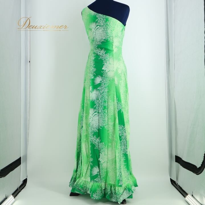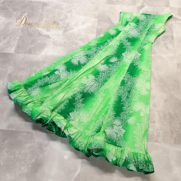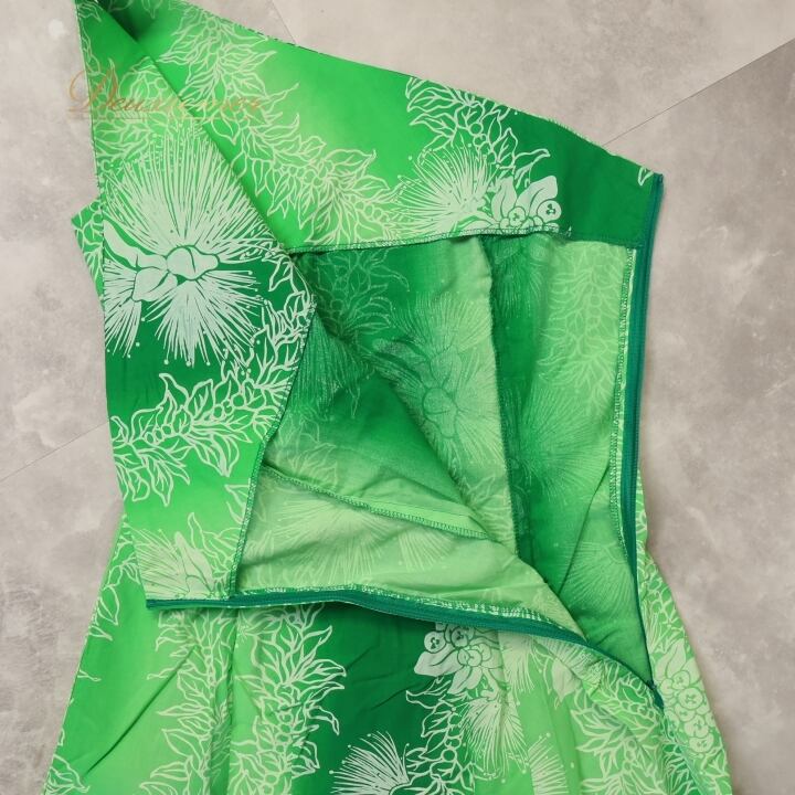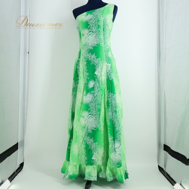 フラダンス 衣装 ワンピース ドレス グリーン系 レフア柄 ハワイアン 緑 白 ワンショルダー ハワイアン アロハ 華やか かわいい ハワイアンプリント 花柄 爽やか