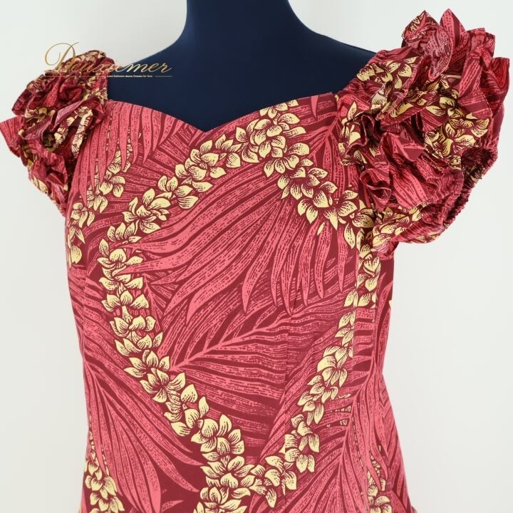 フラダンス 衣装 ワンピース ドレス レッド系 マーメイドライン フラ ダンス マイレ柄 フリル 花柄 赤 黄 華やか ハワイアン MermaidLine MMJ エムエムジェイ 日本製 かわいい アロハ 落ち着いた色 ハワイアンプリント イエロー系