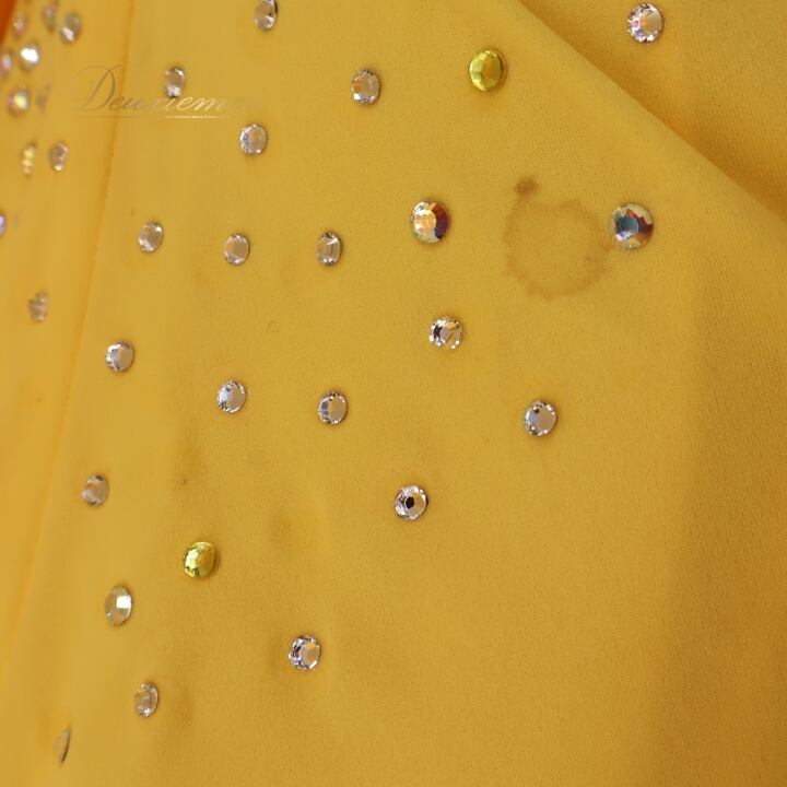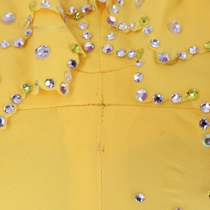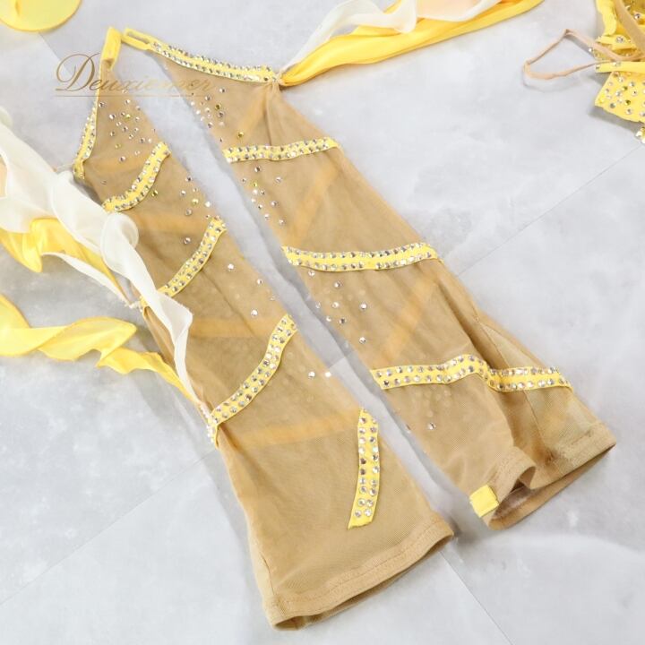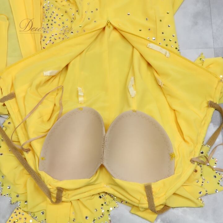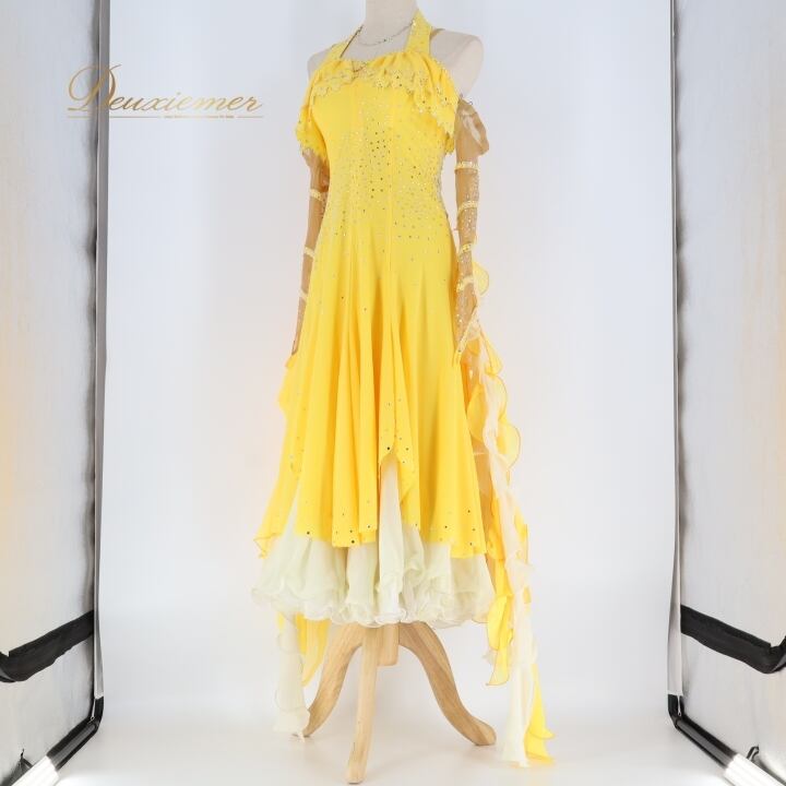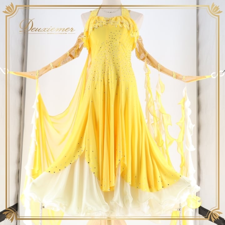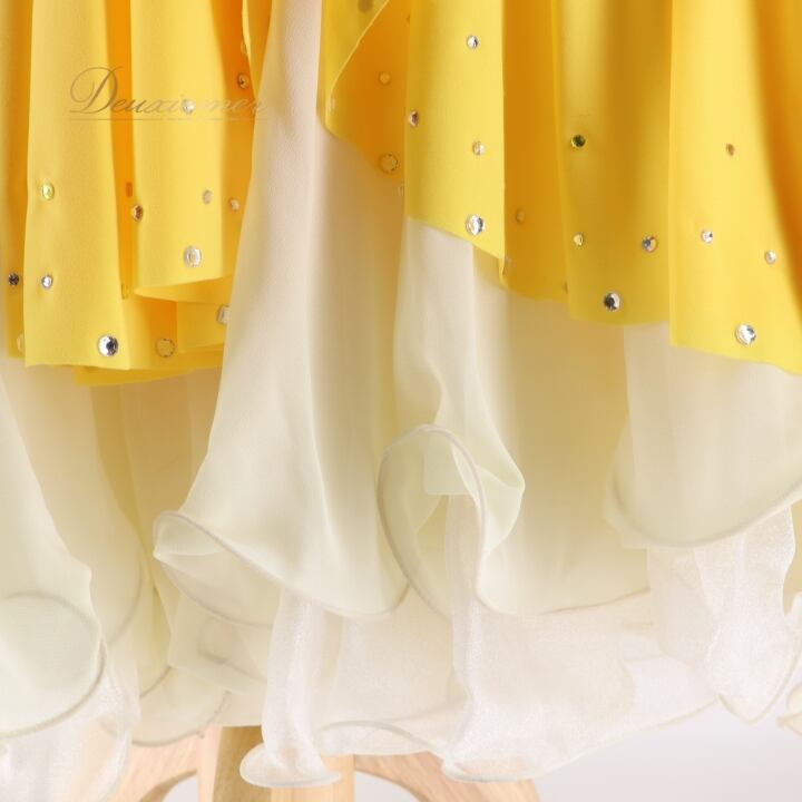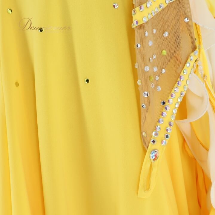 社交ダンス 衣装 スタンダード ドレス ワンピース スタンダードドレス 黄色 フロート レース フリル デモ 競技 ダンス パーティ 発表会 イエロー系 ホワイト系 黄色 白 キラキラ 輝き かわいい エレガント おしゃれ 演出用 ダンスウエア ダンス大会 用衣装 女性用