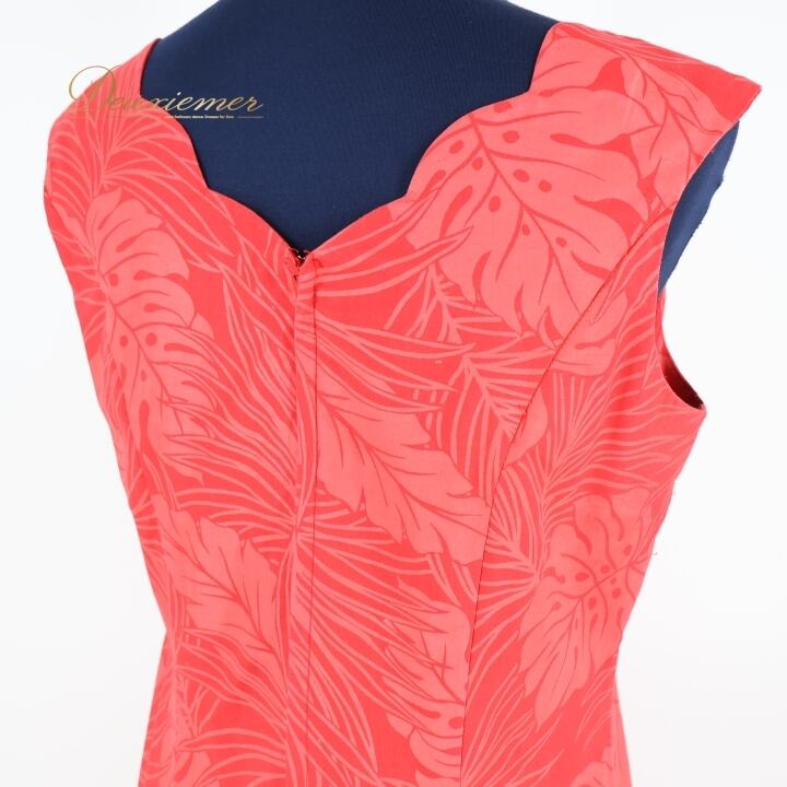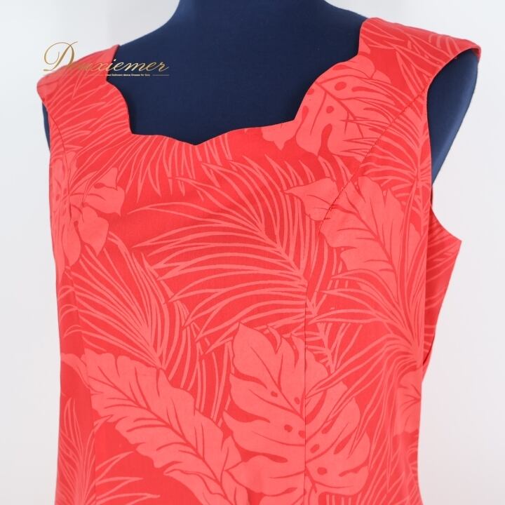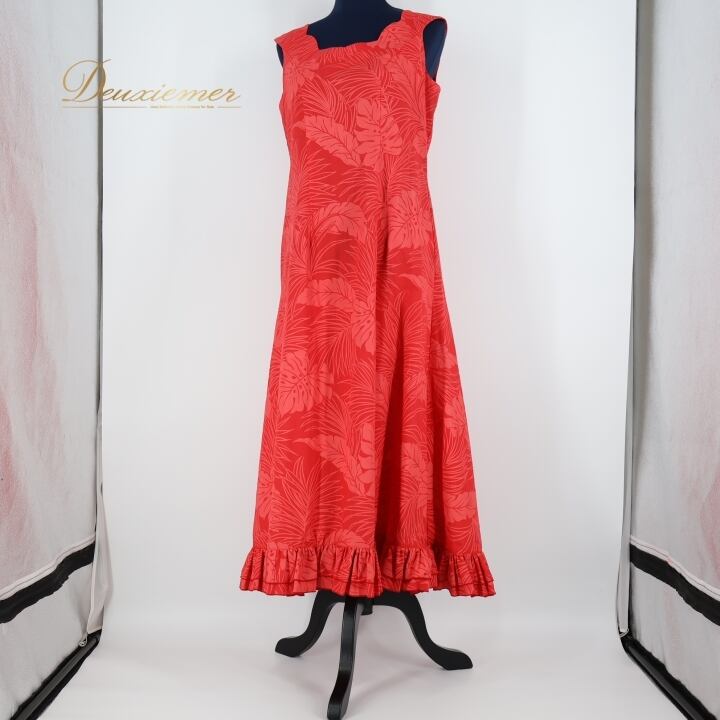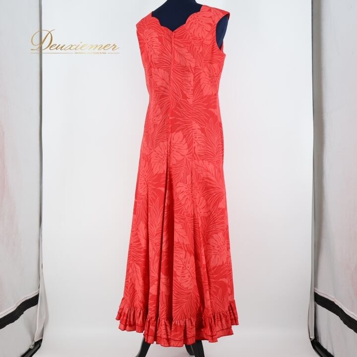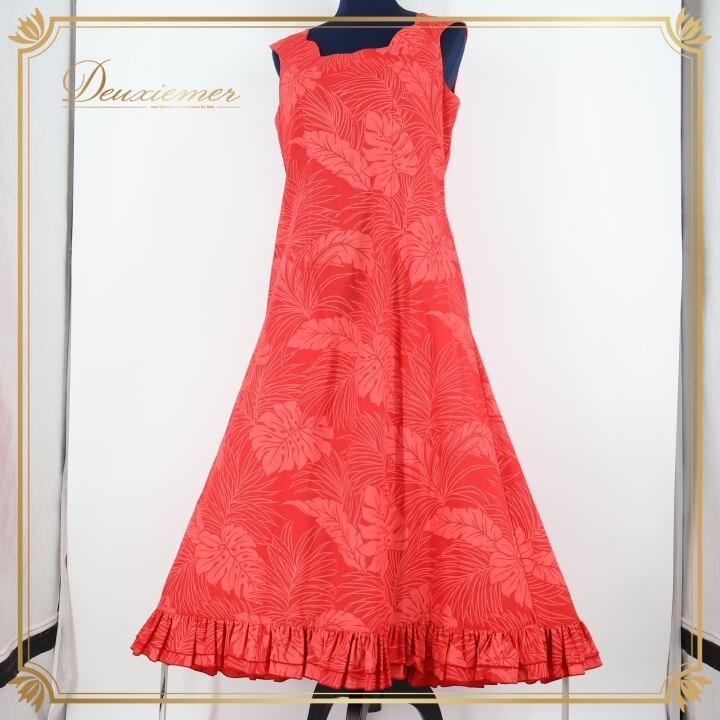 フラダンス 衣装 ワンピース ドレス レッド系 アロハスタンダード フラ ダンス モンステラ柄 リーフ柄 赤 ノースリーブ 鮮やか ALOHA STANDARDS 日本製 ハワイアン アロハ かわいい スカラップ ハワイアンプリント