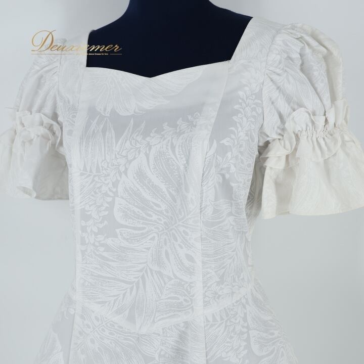 フラダンス 衣装 ワンピース ドレス ホワイト系 マーメイドライン モンステラ柄 レイ柄 ヤシ柄 白 MermaidLine MMJ エムエムジェイ 日本製 爽やか 華やか 明るい ハワイアン アロハ かわいい ハワイアンプリント フラ ダンス