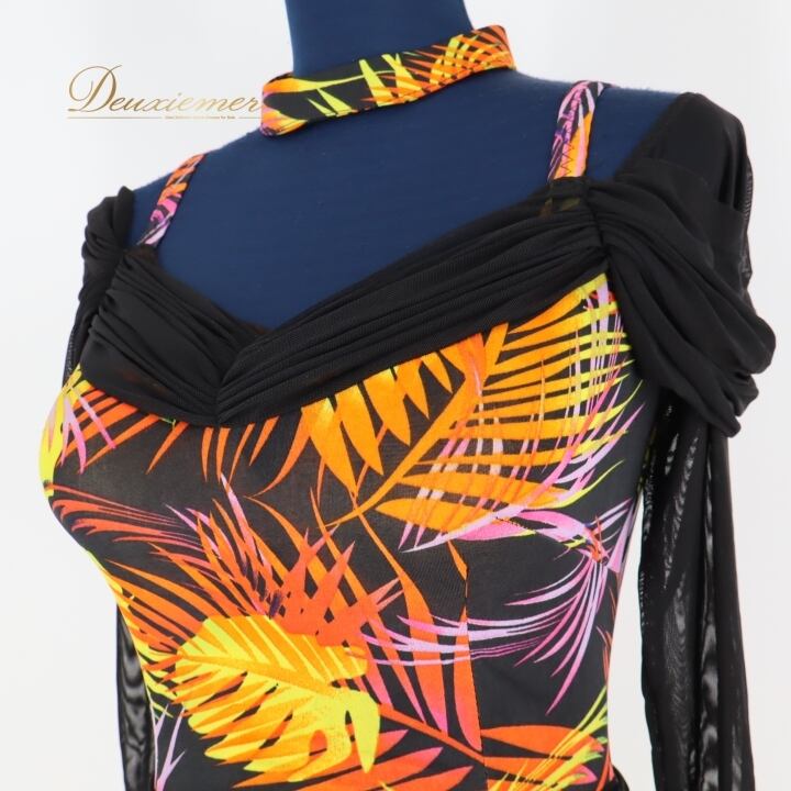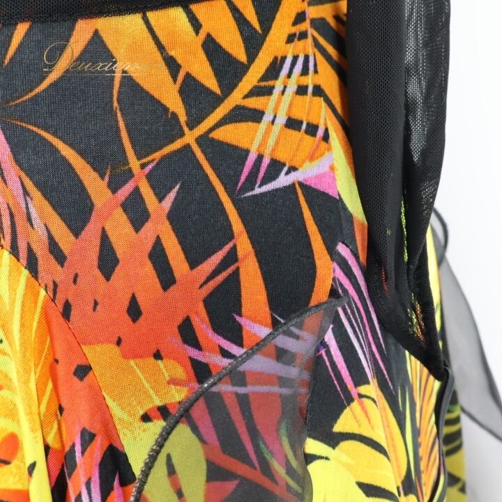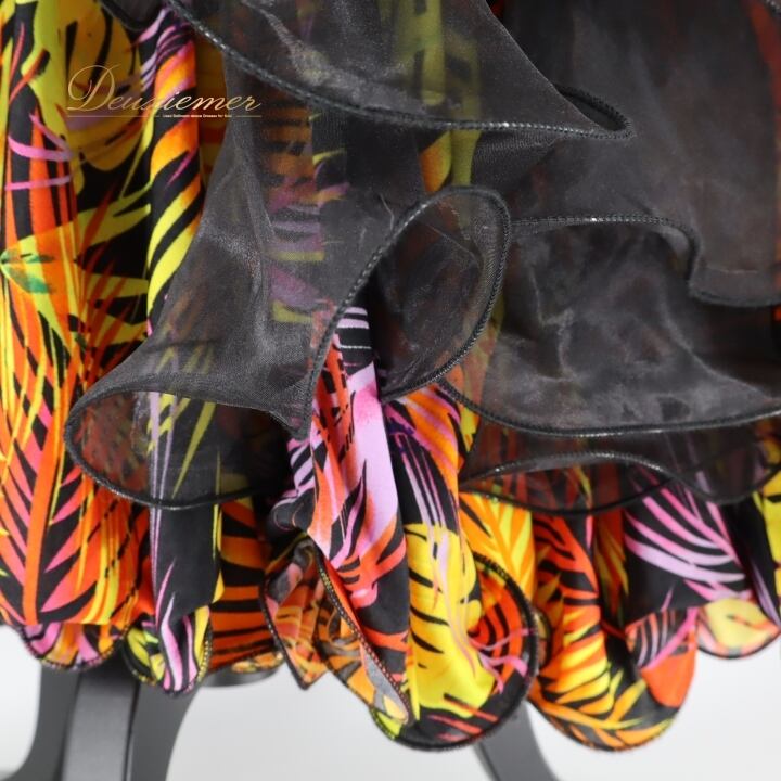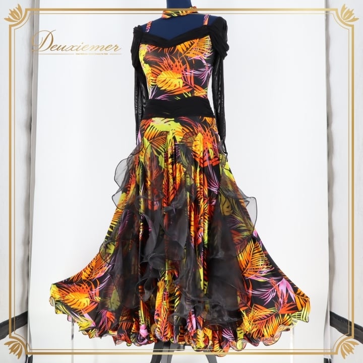 社交ダンス 衣装 スタンダード ドレス ワンピース パーティ 発表会 黒 フリル レース 柄 模様 ブラック系 オレンジ系 伸縮素材 薄い素材 ふんわり広がる Mサイズ レオタード 競技用 衣装 ドレスアップ おしゃれ レディース イベント