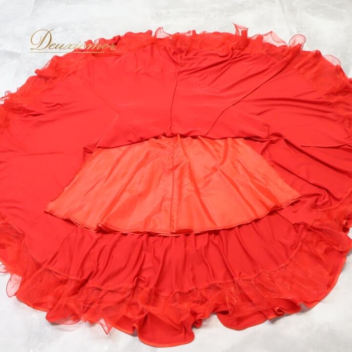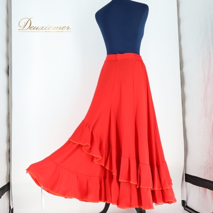 #フラメンコ #衣装 #ファルダ #スカート #プリマブティック #ダンス衣装 #レッスン #パーティ用 #赤無地 #エレガント #女性用 #ストレッチ #オシャレ #トルソー #フラメンコダンス #ファッション #軽め素材 #コーディネート #ダンスパフォーマンス #ENUTSU