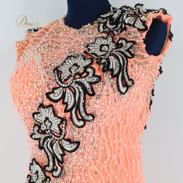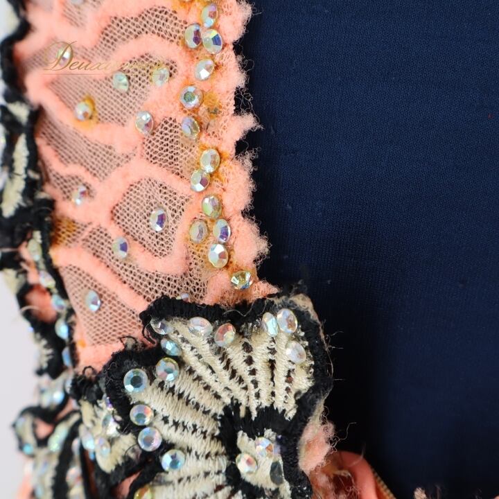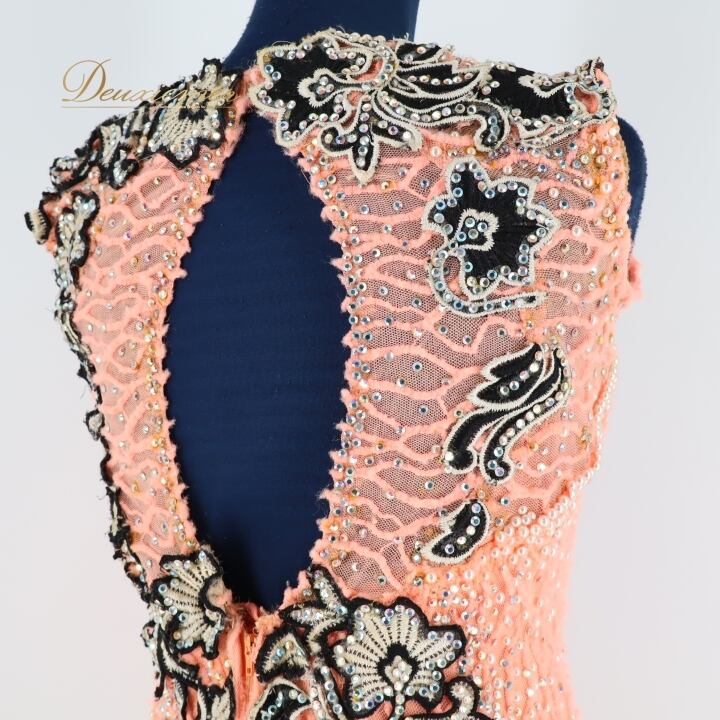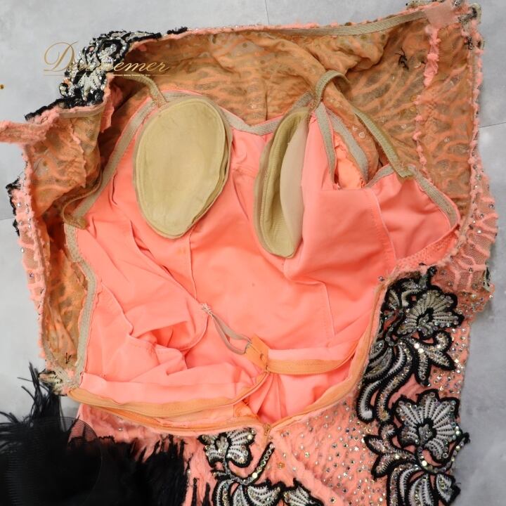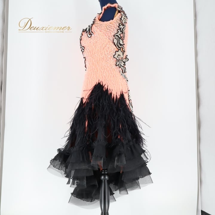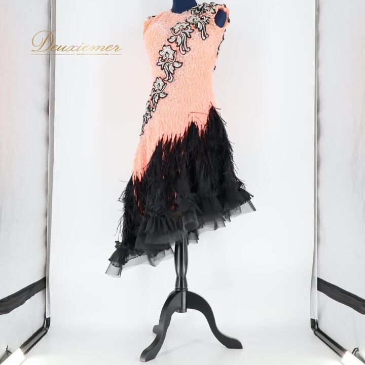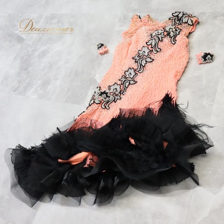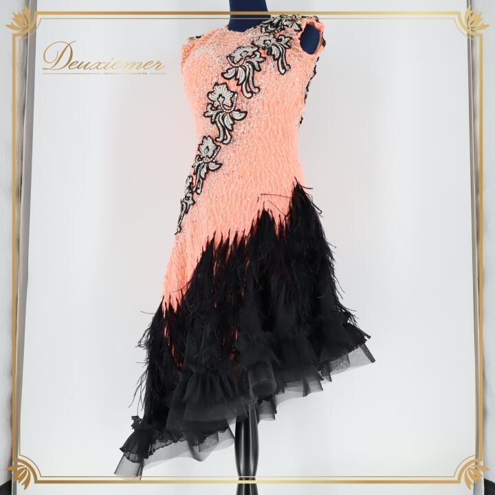 #社交ダンス #ラテンドレス #ダンス衣装 #ファッション #ドレス #女性用衣装 #サーモンピンク #フリル #レース #おしゃれ #特別な日 #イベント #トルソー #カスタムサイズ #ダンスパフォーマンス #スカート #舞台衣装 #スタイル #動きやすい #ENUTSU