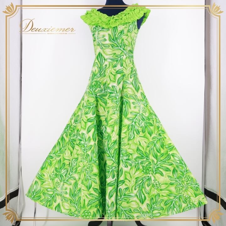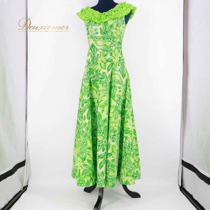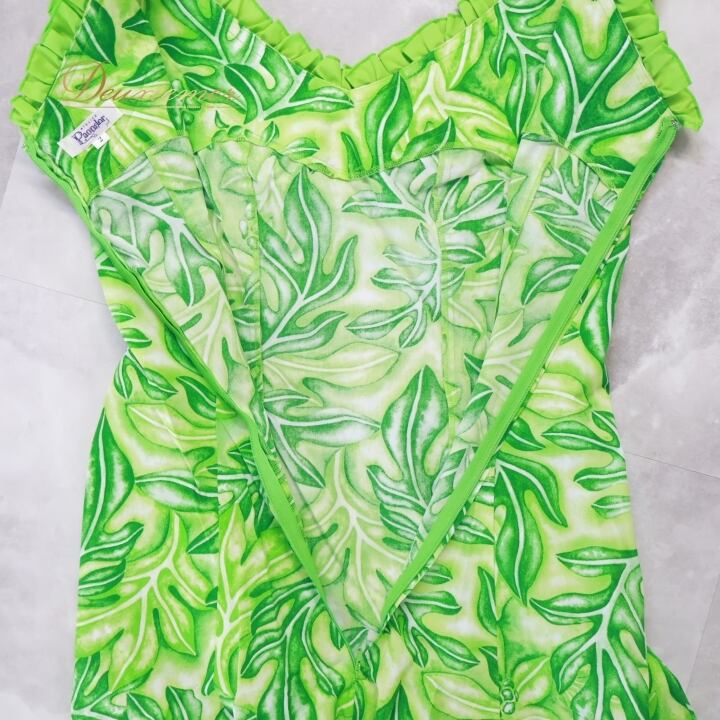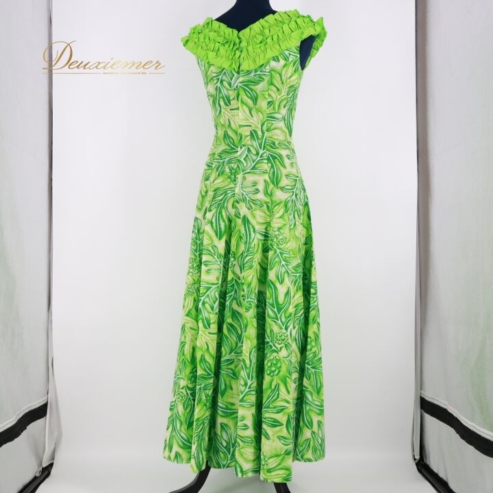 #フラダンス #衣装 #ドレス #ワンピース #日本製 #パンドール #グリーン #ホワイト #ラウアエ柄 #フリル #かわいい #ファッション #舞踏 #ダンス #ウエア #女性用 #サイズ2 #ポリエステル #フラダンス衣装 #ENUTSU