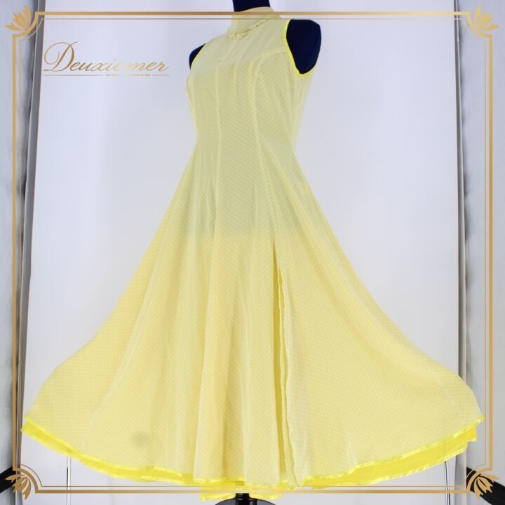 社交ダンス 衣装 スタンダード ドレス ワンピース パーティ衣装 女性用 レディース オールシーズン PAPILLON パピヨン 水玉 ドット イエロー系 黄色 袖なし ノースリーブ フレッシュデザイン 伸縮性無し 日本製 パーティ用 個性的 スリット