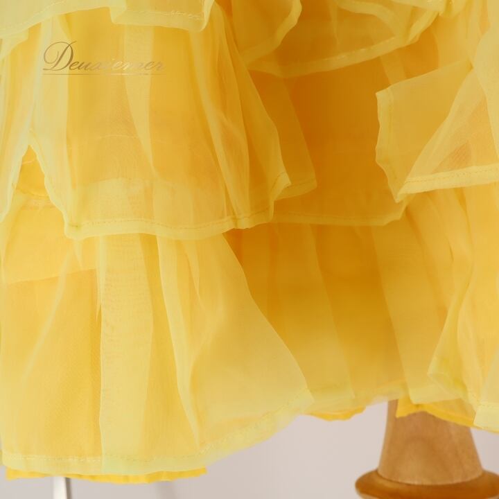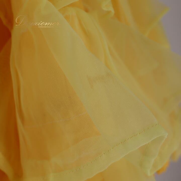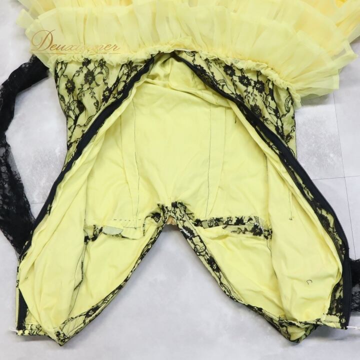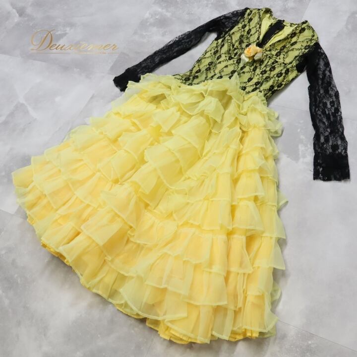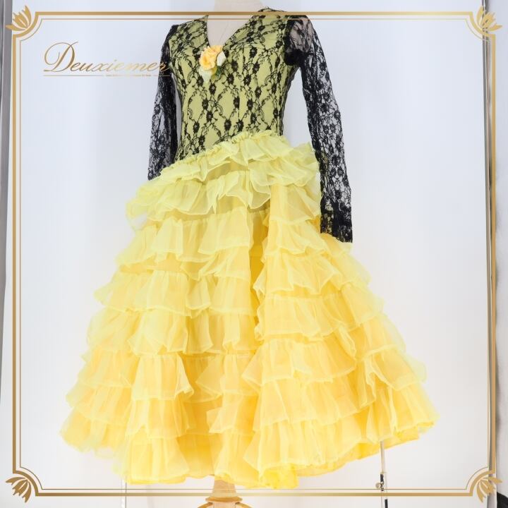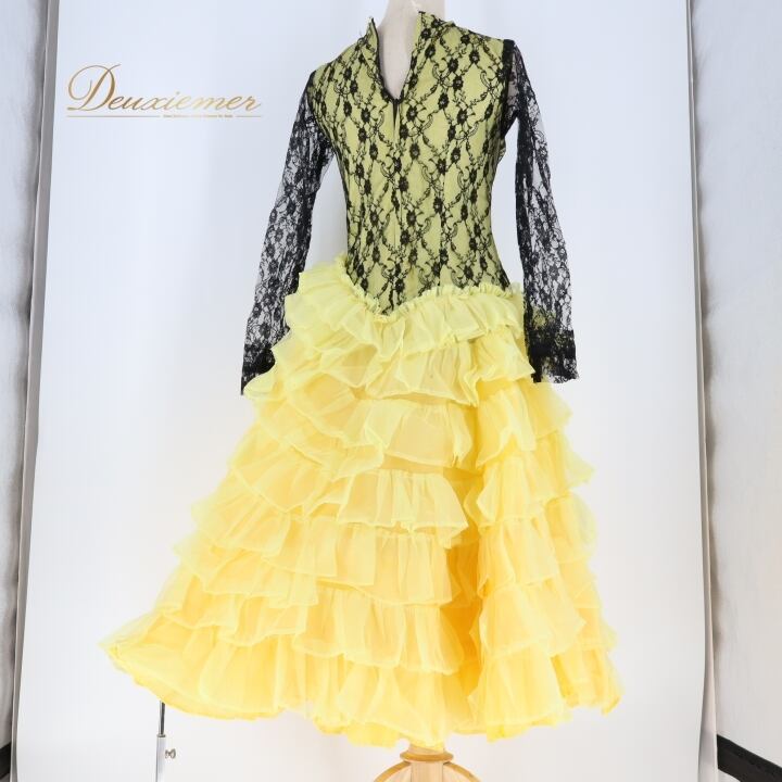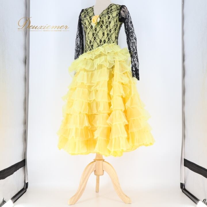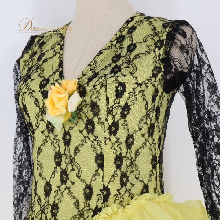 社交ダンス 衣装 ワンピース ドレス パーティ 発表会 ラテン ミニ丈 黄色 黒 レース フリル 軽い かわいい 花 ダンス ブラック系 イエロー系 おしゃれ フェミニン 楽しい フリルドレス ダンス衣装 発表会用衣装 パーティー衣装 可愛いフリル 舞台衣装