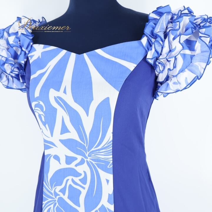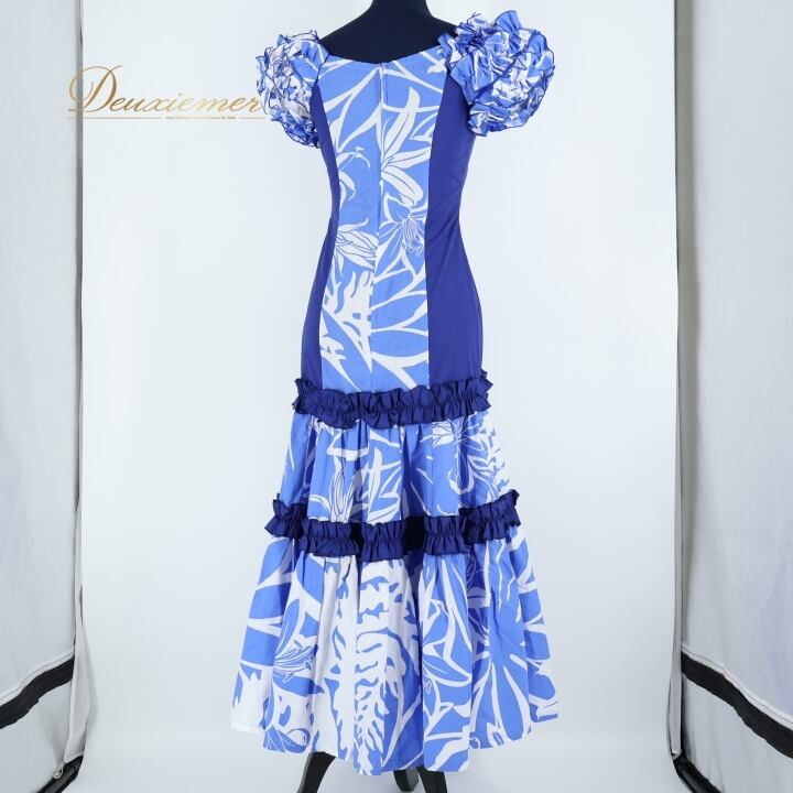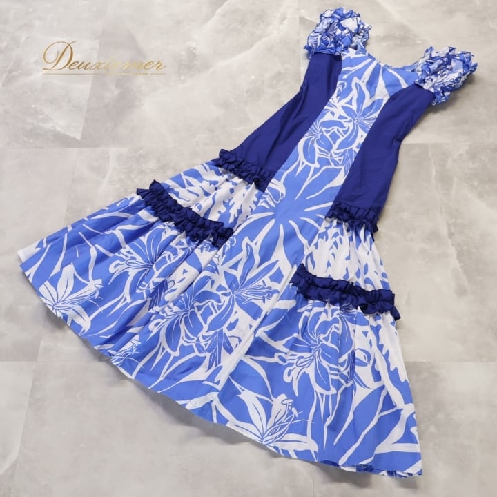 #フラダンス #衣装 #ワンピース #ドレス #ALOHA #アロハスタンダード #日本製 #ブルー #ホワイト #花柄 #フリル #爽やか #バレーパーソン #ダンス衣装 #フラダンス好き #楽器演奏 #夏祭り #パーティー #コスチューム #ENUTSU