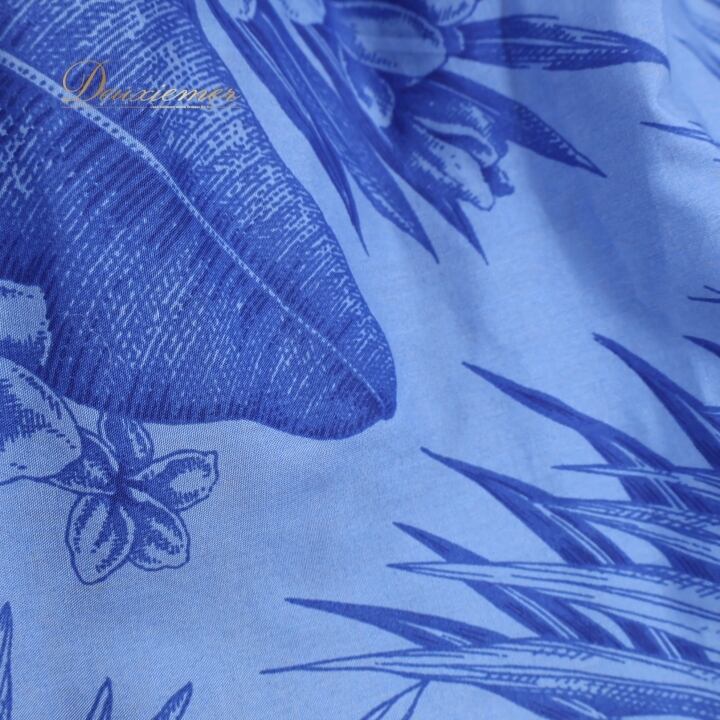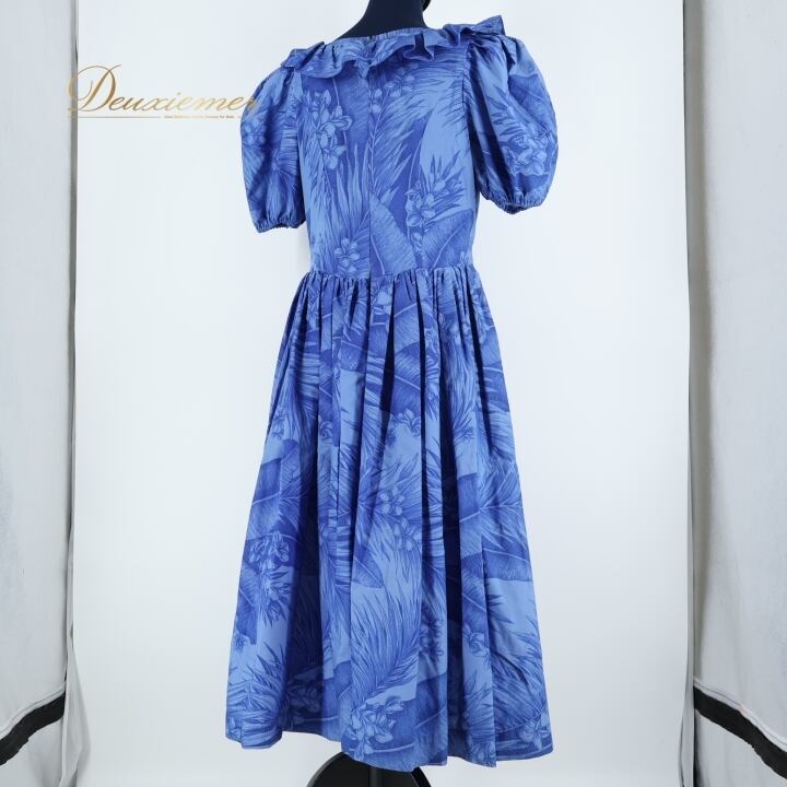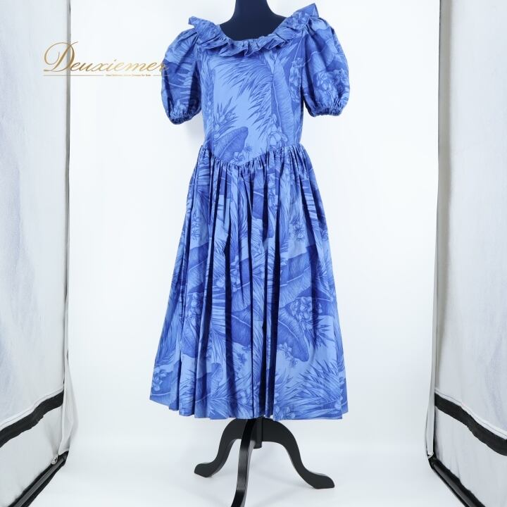 フラダンス 衣装 ワンピース ドレス ブルー系 プルメリア柄 ヤシ柄 青 華やか ハワイアン アロハ 半袖 かわいい ハワイアンプリント 花柄 ふんわり フリル