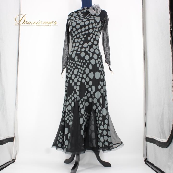 社交ダンス 衣装 スタンダード ドレス ワンピース パーティ衣装 女性用 レディース オールシーズン ブラック系 グレイ系 in the MOOD インザムード 黒 水玉 ドット 長袖 ユニークデザイン コサージュ付き 取り外し可 ポリエステル素材 伸縮性あり