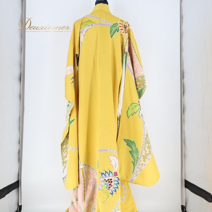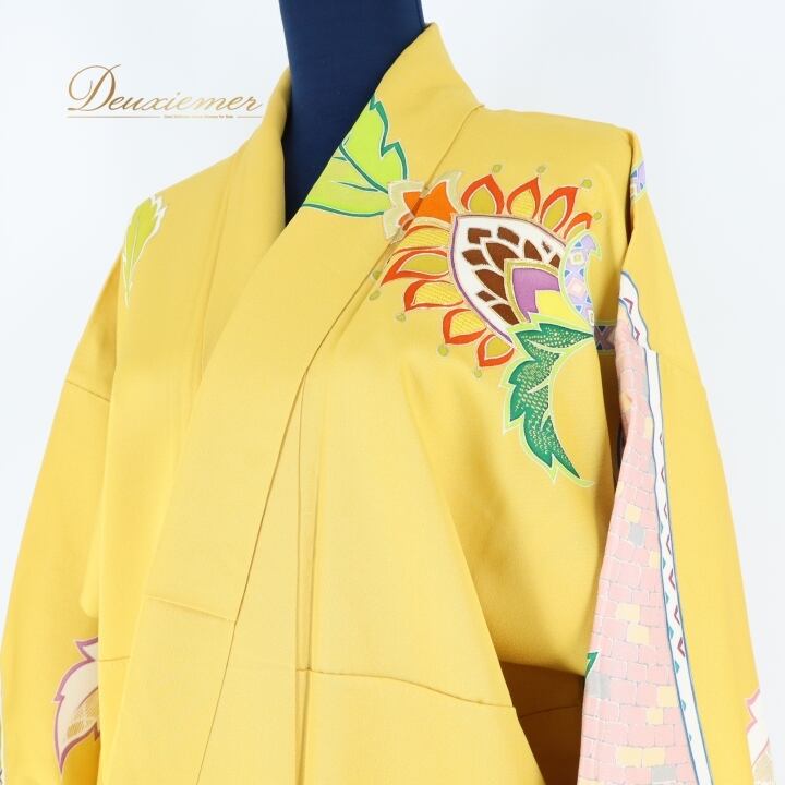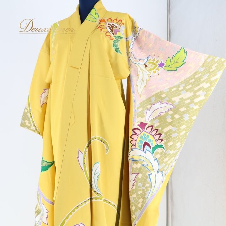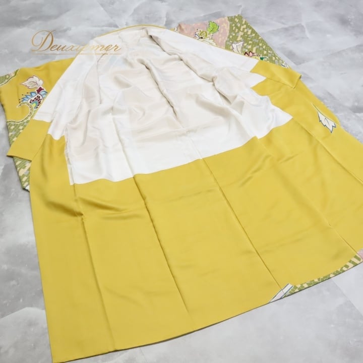 着物 千總 振袖 袷 黄色 絵羽模様 京友禅着物 イエロー系 柄 模様 金彩 銀 衣装 和服 和装 友禅 きもの 結婚式 着付け おしゃれ 伝統 レディース 和服 リサイクル 舞台衣装 結納式 和装体験