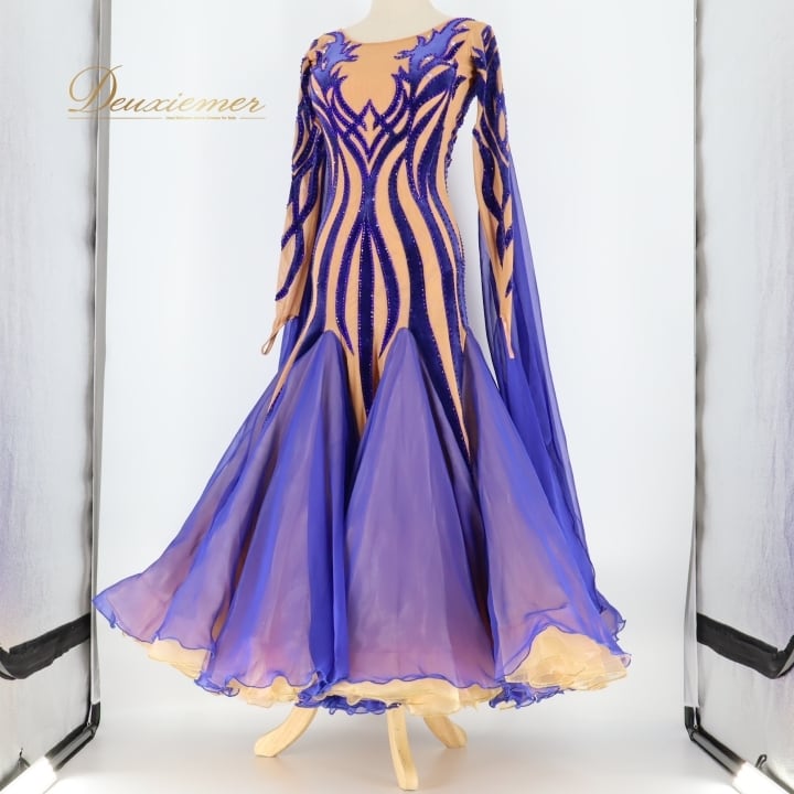 社交ダンス 衣装 スタンダードドレス スタンダード ワンピース ドレス 青 紫 フロート ベロア デモ 競技 ダンス パーティ 発表会 高級感 上品 ベージュ ブルー系 ゴージャス 美しい デザイン 競技用 おしゃれ フォーマル イベント用 エレガント ステージ衣装 パフォーマンス用