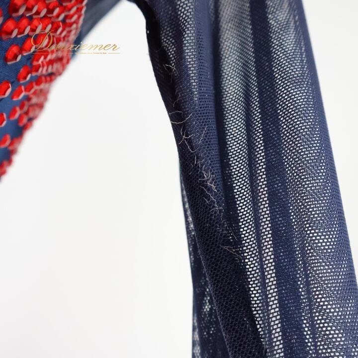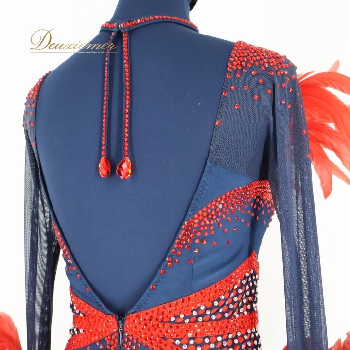 社交ダンス 衣装 スタンダード ドレス スタンダードドレス 紺色 NANAKA ナナカ 赤 羽 フリル デモ 競技 ダンス パーティ 発表会 ネイビー系 レッド系 クロッチ ゴージャス 競技用ドレス 発表会用 衣装オーダー デモ用ドレス