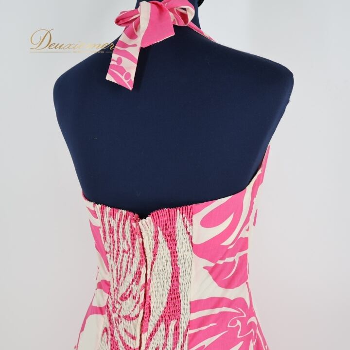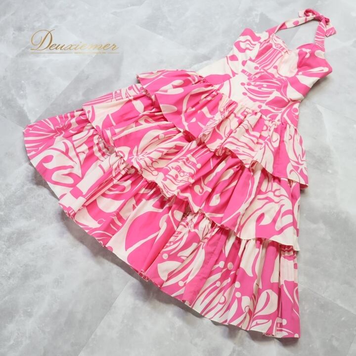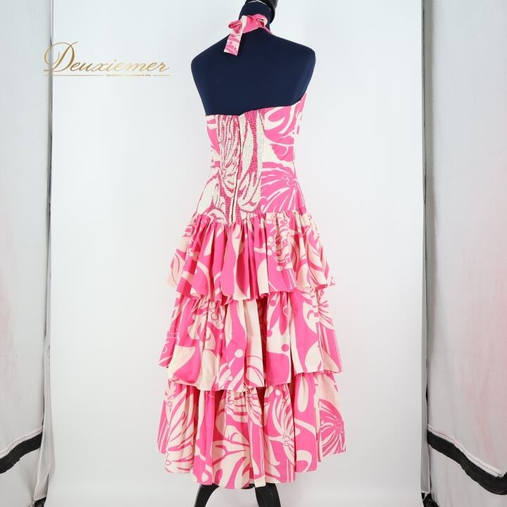 フラダンス 衣装 ワンピース ドレス ピンク系 MAPUANA 花柄 白 フラ ダンス ハワイ製 華やか ハワイアン フリル アロハ かわいい ホルターネック 鮮やか ボリューム ハワイアンプリント ホワイト系
