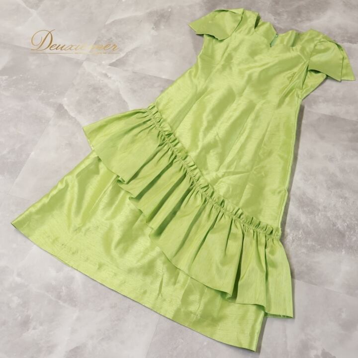 フラダンス 衣装 ワンピース ドレス グリーン系 フラ ダンス 光沢 黄緑 ハワイアン 無地 シンプル 華やか アロハ 半袖 フリル 上品 かわいい ダンス衣装