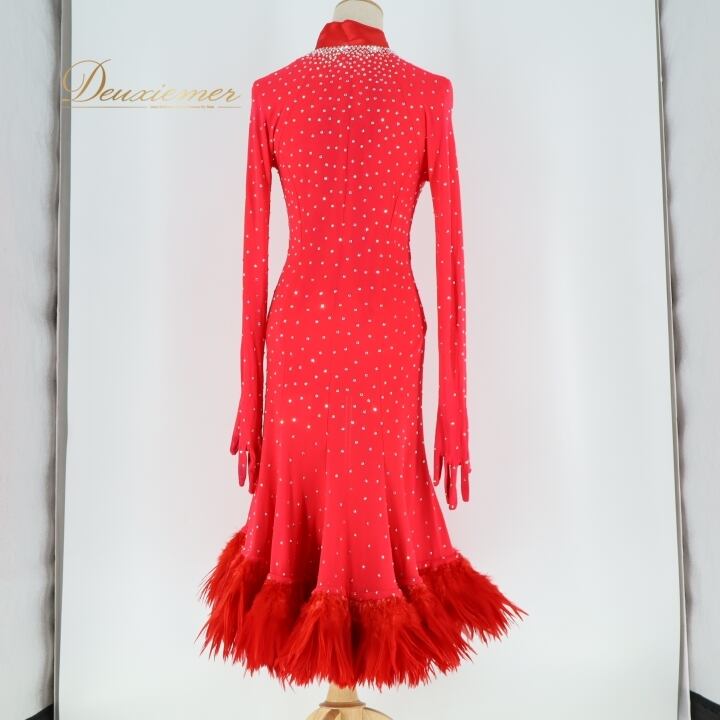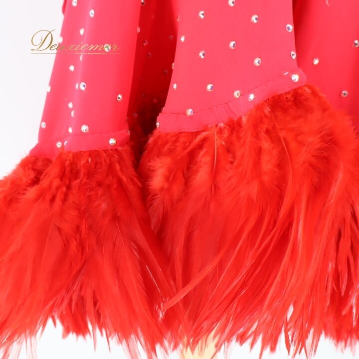 社交ダンス 衣装 ラテン ドレス ワンピース ラテンドレス ヤナギダ YANAGIDA ファー 羽 鮮やか 手袋 アームカバー 蛍光 かっこいい レッド系 ピンク系 デザイン おしゃれ パフォーマンス用 ダンスパーティー レディース ステージ衣装 美しい 目を引く 豪華な