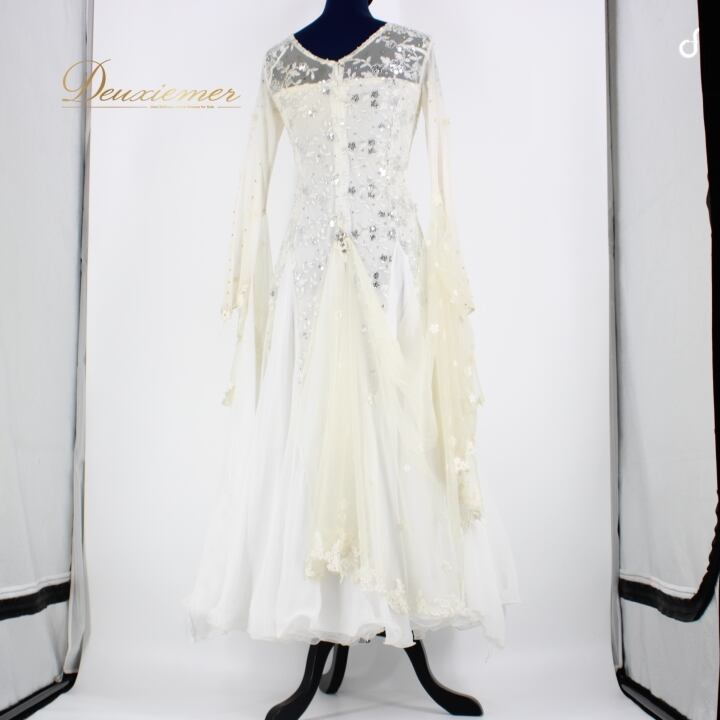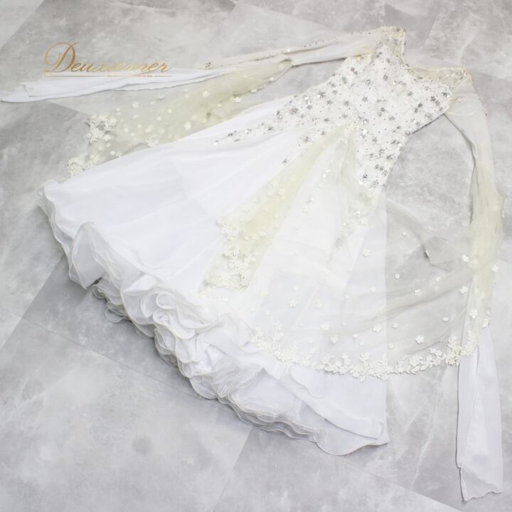 #社交ダンス #ダンスドレス #ホワイトドレス #レースドレス #華やか #ラインストーン #スパンコール #ドレスコーデ #ダンス衣装 #フロート付き #舞台衣装 #美しいライン #ステージ映え #女性用トルソー #ダンススタイル #フォーマルドレス #特別な日 #ダンスパフォーマンス #エレガント #ENUTSU