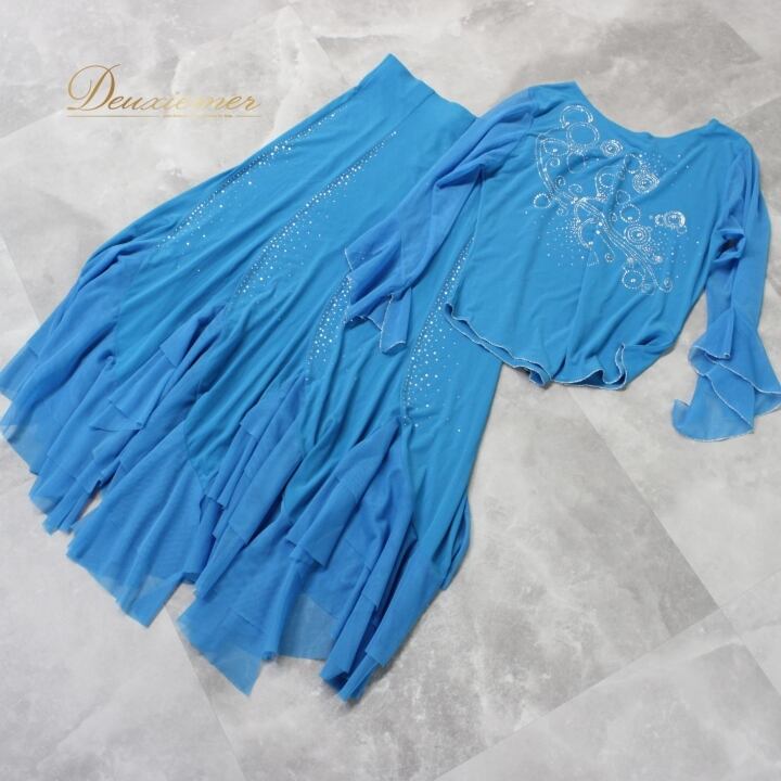 社交ダンス 衣装 スタンダード 上下セット ツーピース レッスンウェア パーティ衣装 女性用 レディース オールシーズン 水色 Leirena レイリーナ ブルー系 ラインストーン スカート セットアップ トップス 伸縮性 ポリエステル ウエストゴム仕様