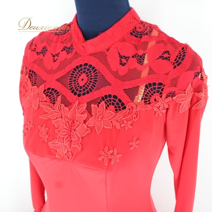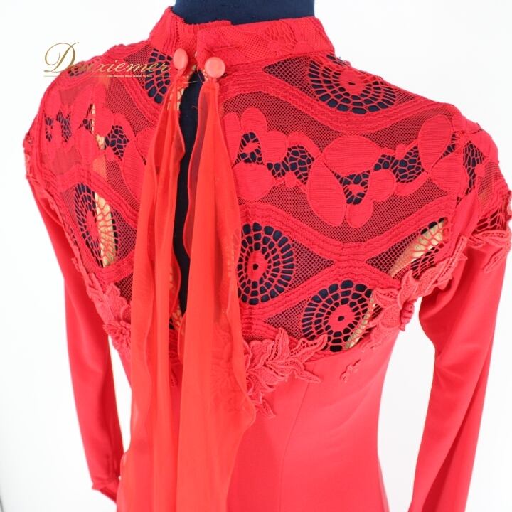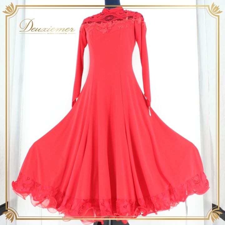 社交ダンス 衣装 スタンダード ドレス ワンピース パーティ衣装 女性用 レディース オールシーズン 赤 レッド系 lovely dancing レース 長袖 ボリューム スカート 優雅 動き フォーマル 体型カバー 薄手 伸縮性 おしゃれ 上品 カジュアル