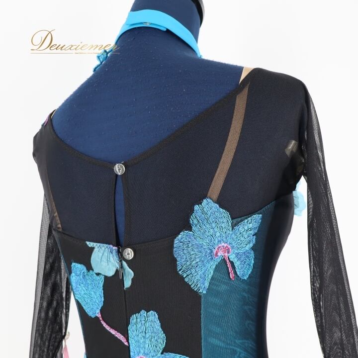 #社交ダンス #ダンスドレス #ワンピース #衣装 #日本製 #in_the_MOOD #フリルデザイン #青黒 #ポリエステル #伸縮性 #胸パッド #女性用トルソー #コンパクトフィット #ダンスファッション #イベント衣装 #パーティードレス #おしゃれ #すっきりシルエット #ダンススタイル #ENUTSU