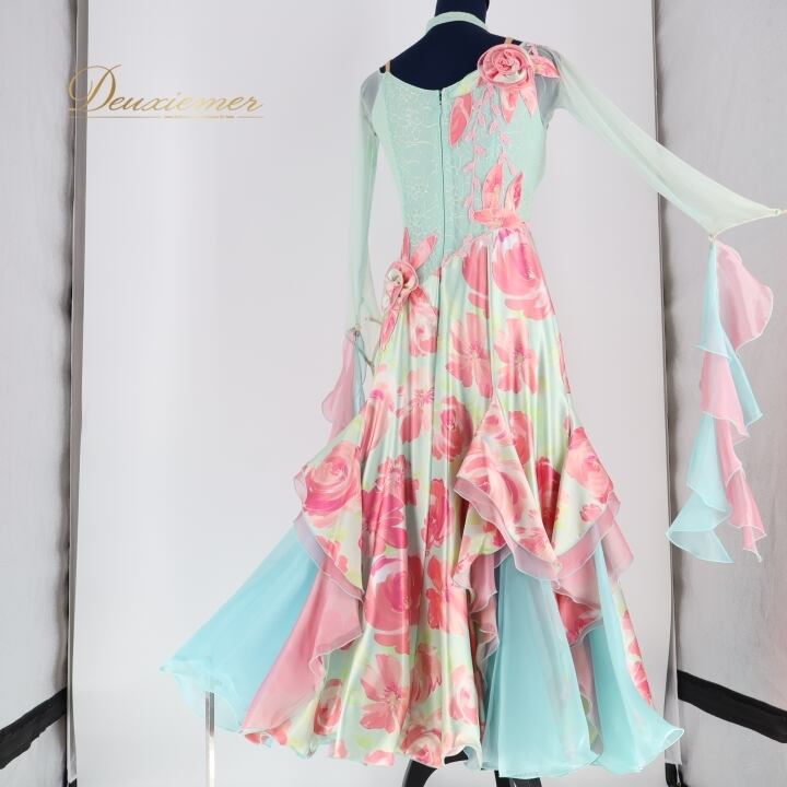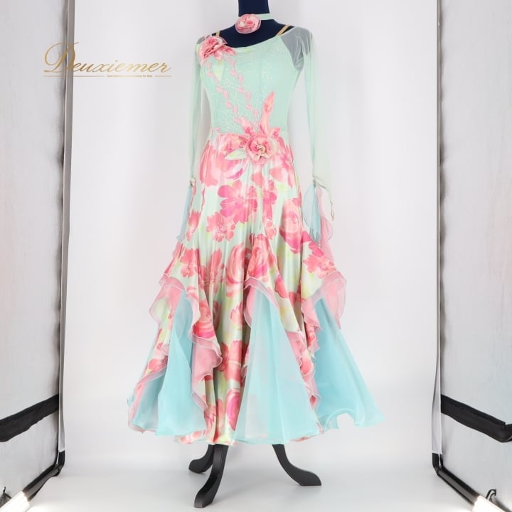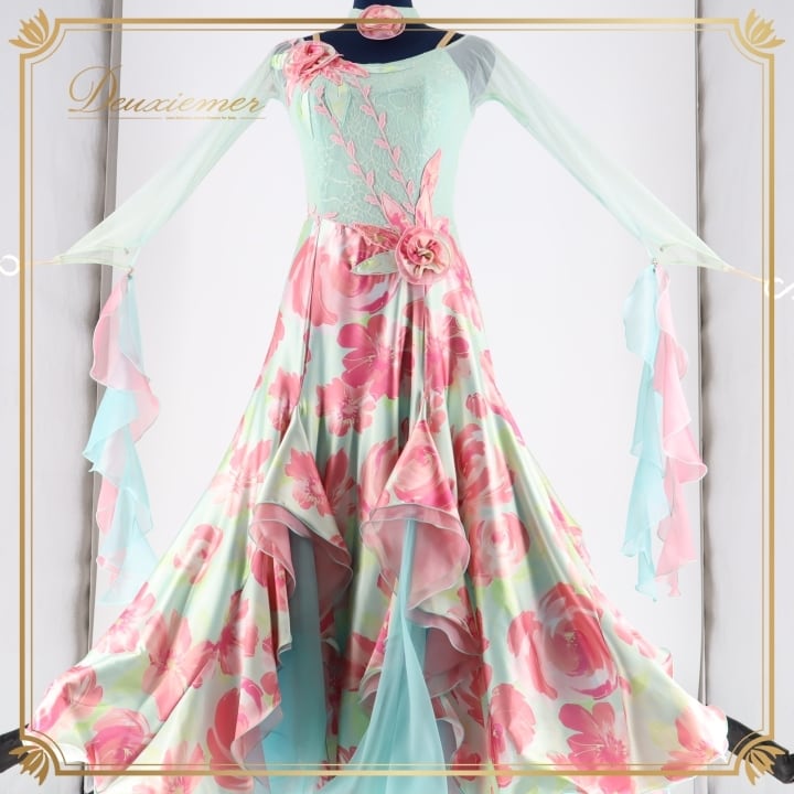 社交ダンス 衣装 スタンダード ドレス スタンダードドレス ワンピース 花柄 ミント SEKINE セキネ デモ 競技 パーティ 発表会 日本製 ピンク系 ブルー系 グリーン系 花柄 カラフル おしゃれ 可愛い 女性用 ドレス ワンピースドレス フラワープリント ダンス衣装 発表会用 スタイルアップ 舞台衣装 競技用 花モチーフ