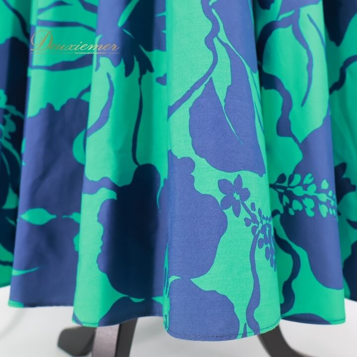 フラダンス 衣装 ワンピース ドレス グリーン系 フラ ダンス ハイビスカス柄 花柄 緑 紺 華やか ハワイアン アロハ かわいい ハワイアンプリント 鮮やか ネイビー系
