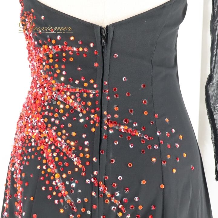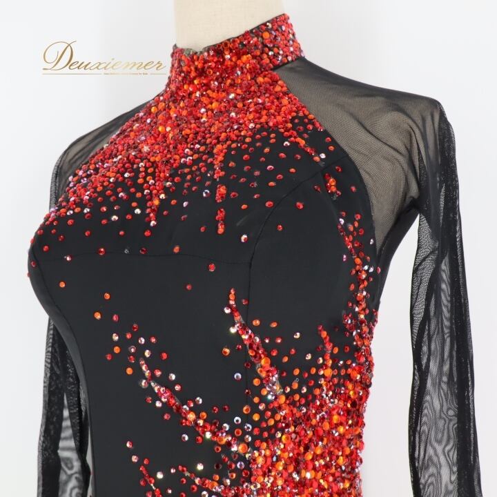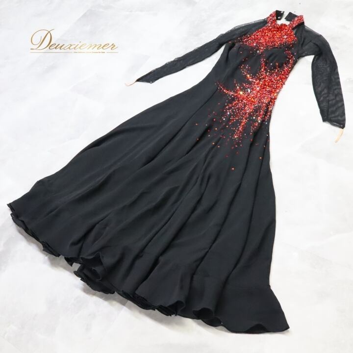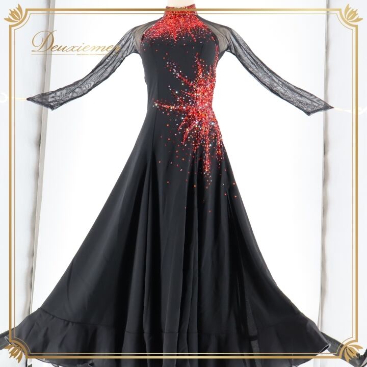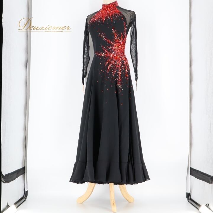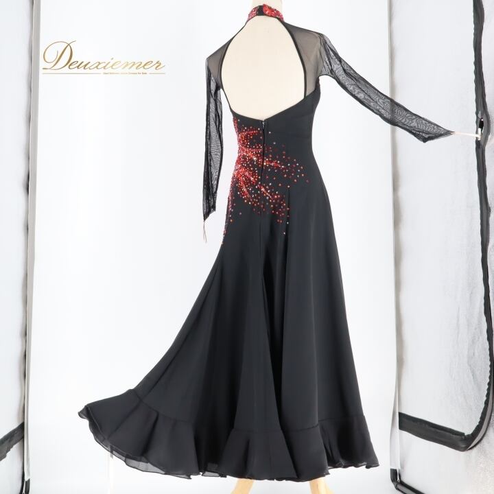 社交ダンス 衣装 スタンダードドレス ドレス スタンダード ワンピース 黒 赤 デモ 競技 ダンス パーティ 発表会 Hiroko&Masahiro ヒロコマサヒロ ブラック系 レッド系 スリット おしゃれ ゴージャス デザイン 石 ショー装 競技用 ダンス衣装 パフォーマンス フォーマル ファッション シンプルエレガンス