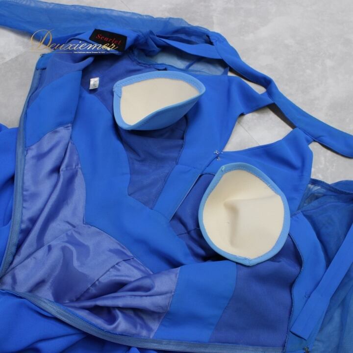 社交ダンス 衣装 スタンダード ドレス ワンピース パーティ衣装 女性用 レディース オールシーズン 青 Scarlet スカーレット ブルー系 レース 無地 スリット フォーマル 鮮やか 上品 シンプル セクシー 高級感 対応サイズM パーティーコスチューム ダンス衣装 ステージ衣装 発表会 結婚式 ディスコ 講演会 ダンスパーティ 衣装選び きれい エレガント コーディネート ディテール