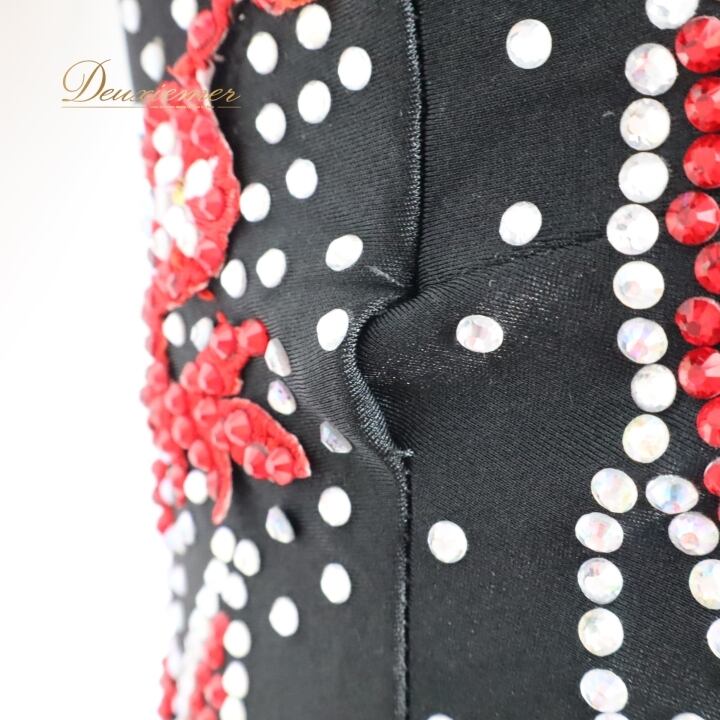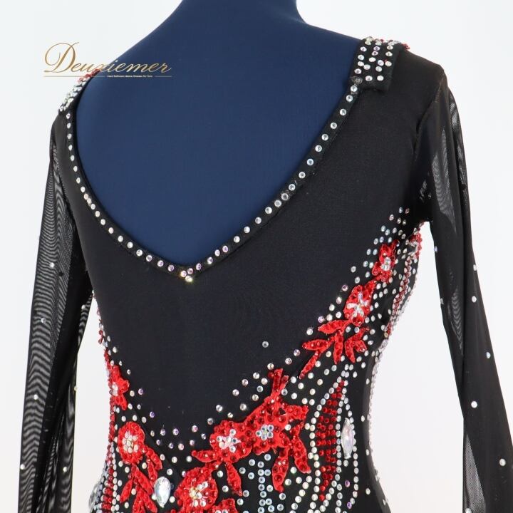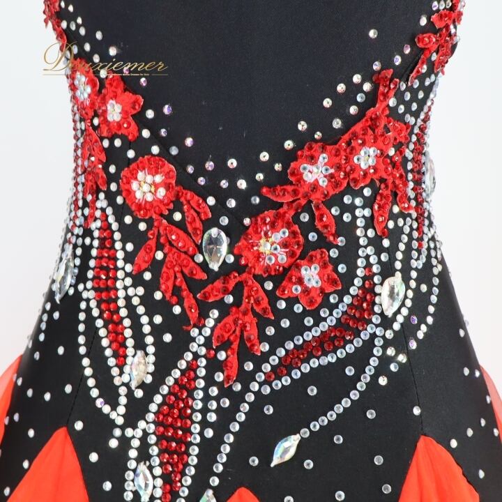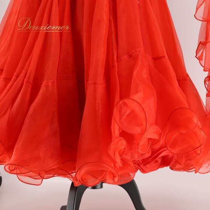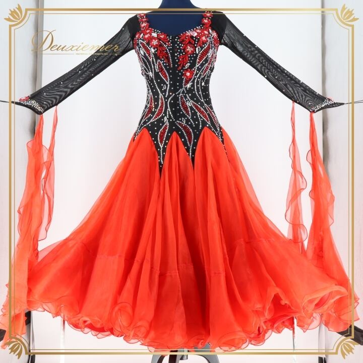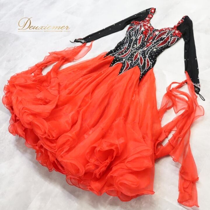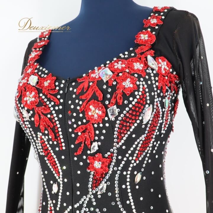 社交ダンス 衣装 スタンダードドレス スタンダード ドレス ワンピース 黒 赤 フロート デモ 競技 パーティ 発表会 フリル ブラック系 レッド系 コンペティション用 スカート おしゃれ コスチューム 競技衣装
