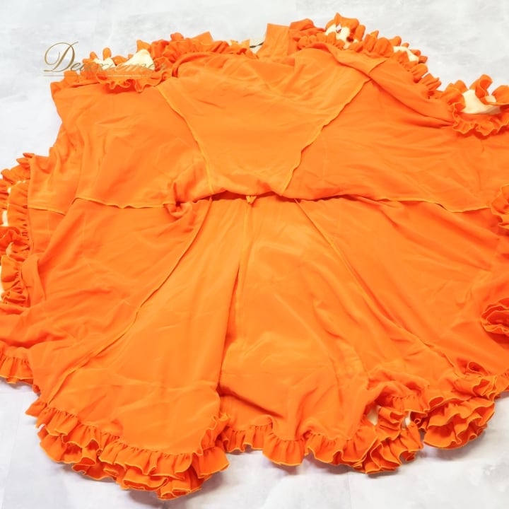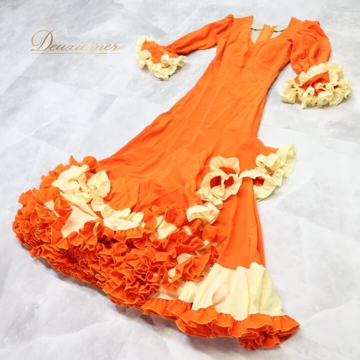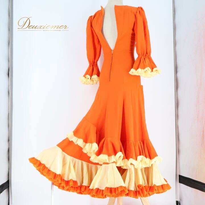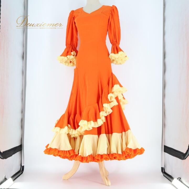 #フラメンコ #衣装 #ドレス #ワンピース #フリフリ #オレンジ #鮮やか #ダンス衣装 #演技服 #コスチューム #女性用 #トルソー #サイズ感 #祭り #パフォーマンス #ファッション #ステージ衣装 #デザイン #特別な日 #ENUTSU