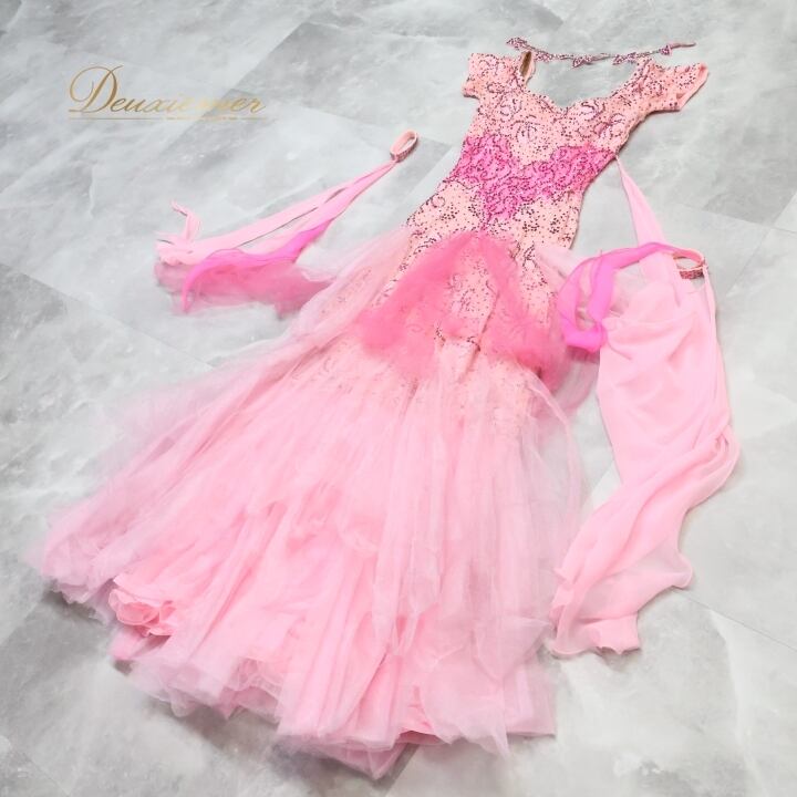 社交ダンス 衣装 スタンダード ドレス スタンダードドレス ワンピース デモ フロート レース 競技 ダンス パーティ 発表会 チュール ピンク系 明るい ピンク チュールドレス スカート2枚 重ねデザイン 競技用 フェミニン スタイル 演出用 ダンスイベント 発表会衣装 女性用 ドレス スタンダードスタイル 競技用衣装
