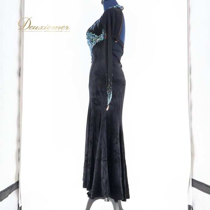 社交ダンス 衣装 ワンピース ドレス ベロア 黒 高級感 デモ 競技 パーティ 発表会 緑 青 クロッチ ブラック系 エレガント フォーマル 競技会 女性用 大人用 おしゃれ 上品 ストレッチ パーティードレス クラシック