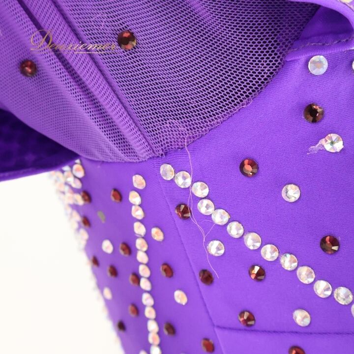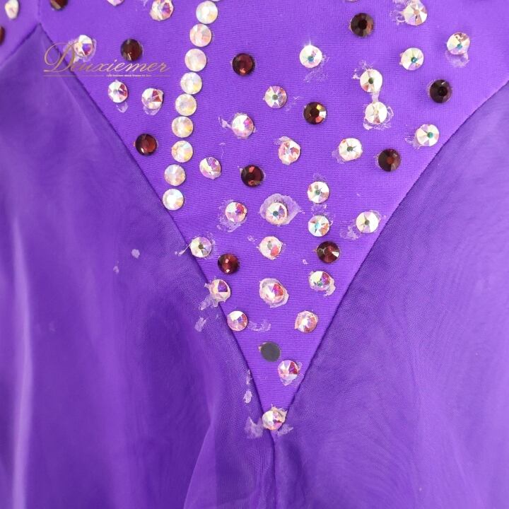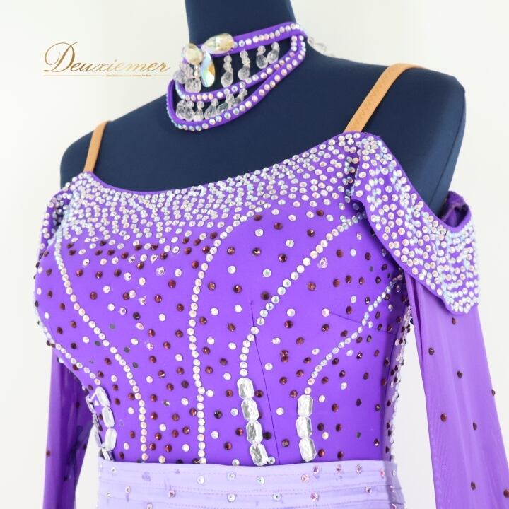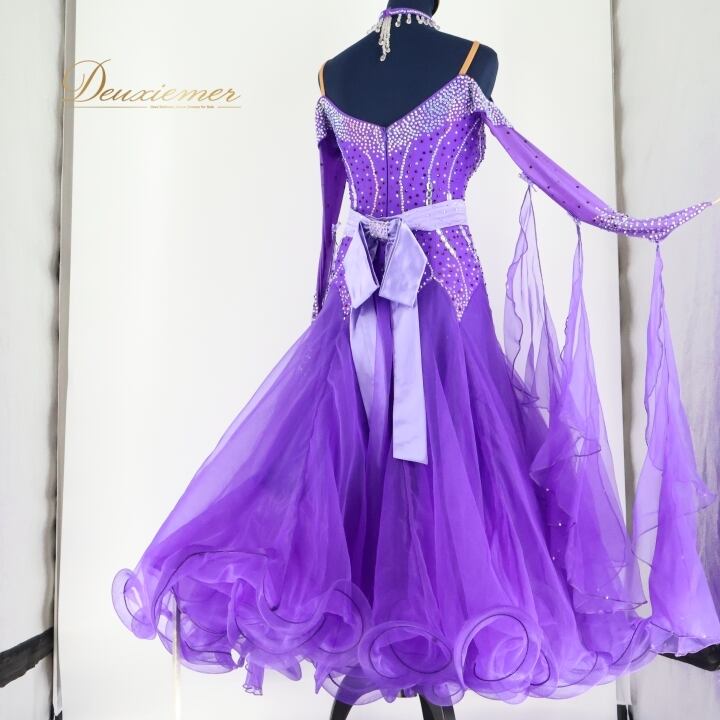 #社交ダンス #ダンス衣装 #ワンピース #紫色 #おしゃれ #レオタード #ファスナー #フロート #リボンデザイン #スカート三枚重ね #高級感 #ダンスパフォーマンス #ダンスファッション #胸パッド #女性用トルソー #ウエスト #ダンススタイル #ダンス用ドレス #パーティー衣装 #ENUTSU
