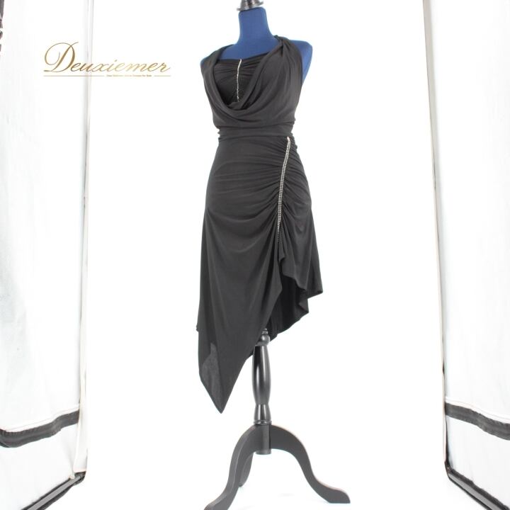 社交ダンス 衣装 ラテン ドレス ツーピース パーティ衣装 女性用 レディース オールシーズン 黒 create-sun クリエイトサン ブラック系 ラインストーン 伸縮性 ドレープデザイン 洗練された デザイン 肩掛け ストレッチ素材 おしゃれ イベント用