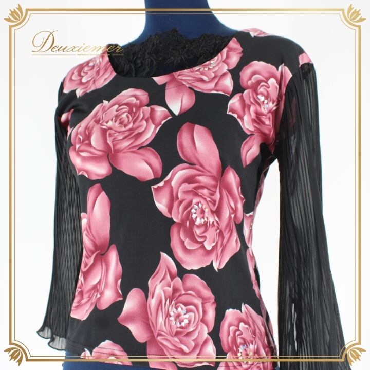#社交ダンス #ダンス衣装 #トップス #花柄 #ブラックピンク #ユーナ #伸縮性 #女性用トルソー #ダンスファッション #おしゃれ #トレンド #ダンススタイル #衣装 #演出 #パフォーマンス #社交ダンス衣装 #アパレル #コスチューム #フラワープリント #ENUTSU