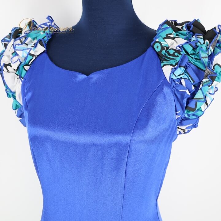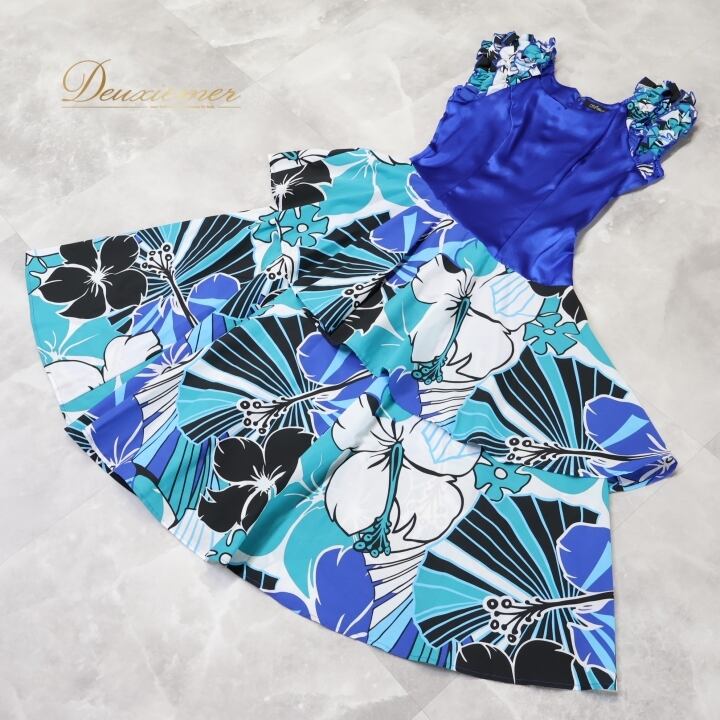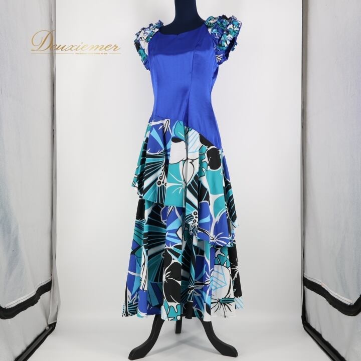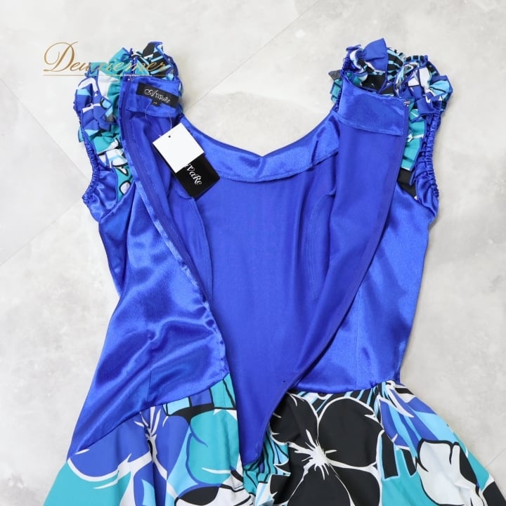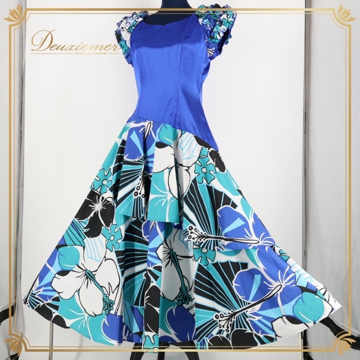 #フラダンス #衣装 #ワンピース #ドレス #Mサイズ #ファッション #女性服 #ブルー #光沢 #フリル #カラフル #アビバーレ #ポリエステル #綿 #トルソー #オシャレ #ダンス #パフォーマンス #クイーン #ENUTSU