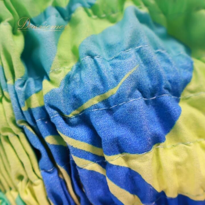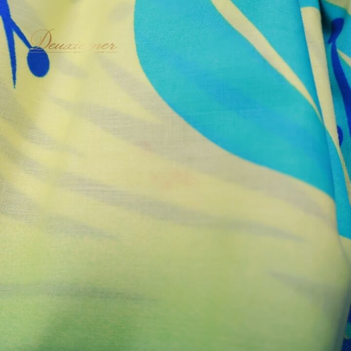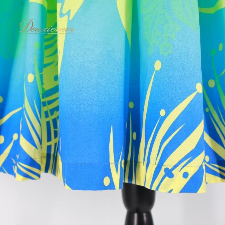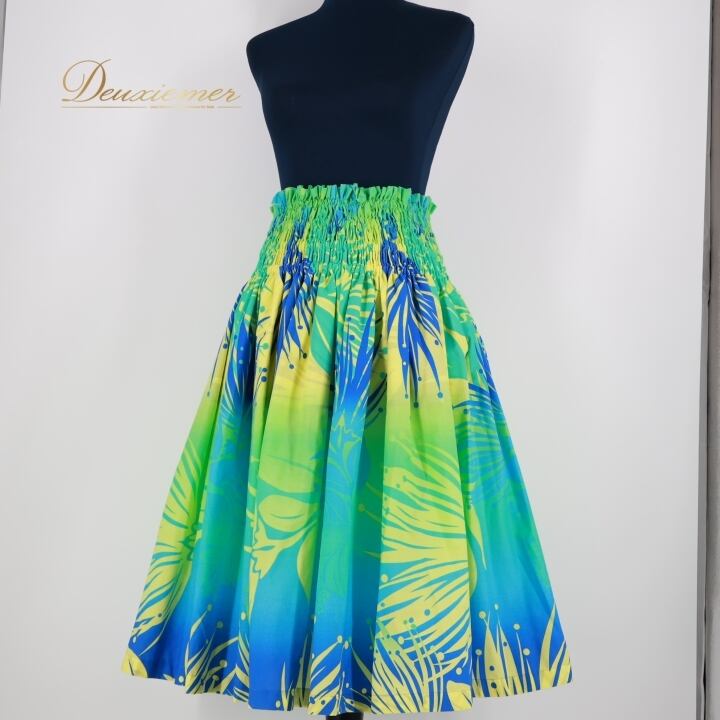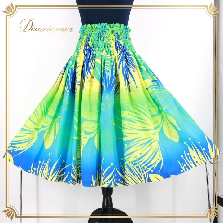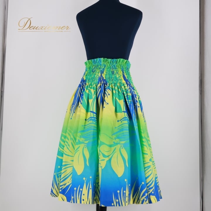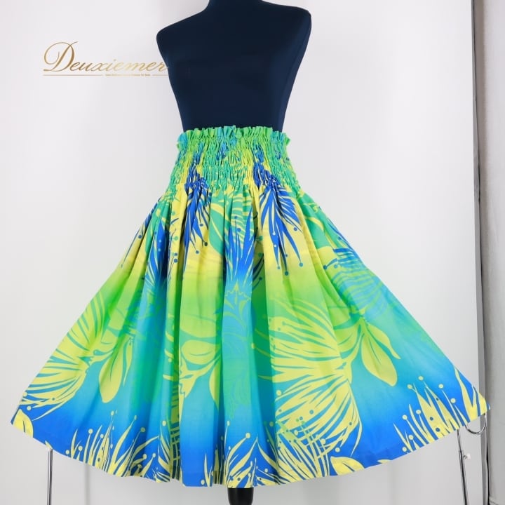 フラダンス 衣装 パウスカート グリーン系 エムエムジェイ シングル フラ ダンス レフア柄 花柄 日本製 青 緑 黄 グラデーション 鮮やか 華やか ハワイアン アロハ レッスン 練習 ハワイアンプリント ブルー系 イエロー系 花柄 デザイン ポリエステル 可愛い 薄手 スカート フレアデザイン 緑色 鮮やかさ 柔らかい おしゃれ イベント ハワイ
