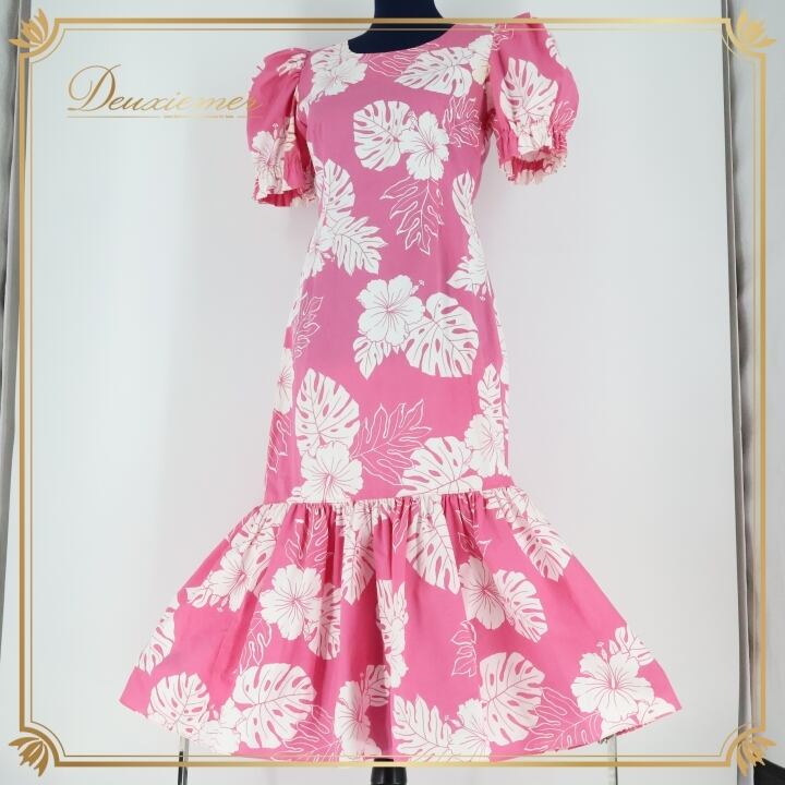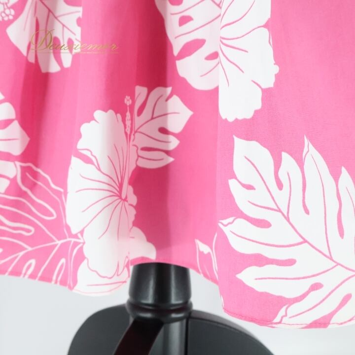 #フラダンス #衣装 #ワンピース #ドレス #ハワイアンプリント #ピンク #ホワイト #明るい衣装 #可愛い #ダンス衣装 #女性用 #トルソー #総丈117cm #肩幅34cm #ウエスト37cm #ファスナー仕様 #伸縮性無し #ハワイ文化 #フラダンス衣装販売 #ENUTSU
