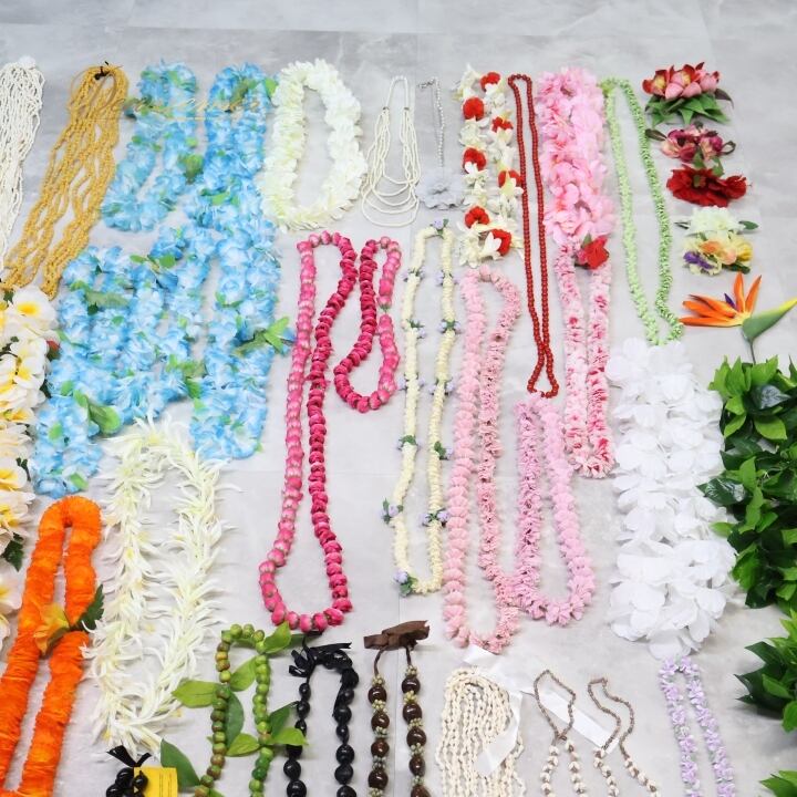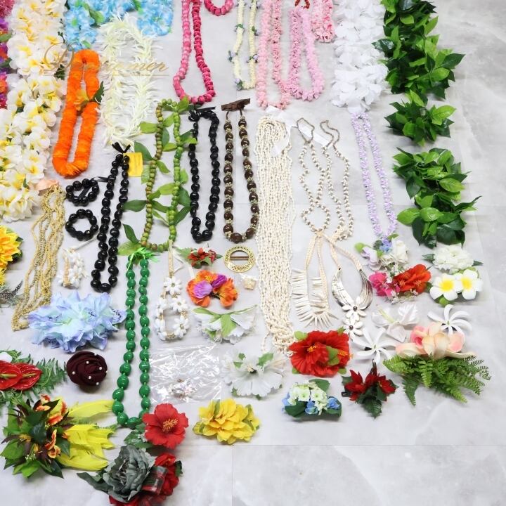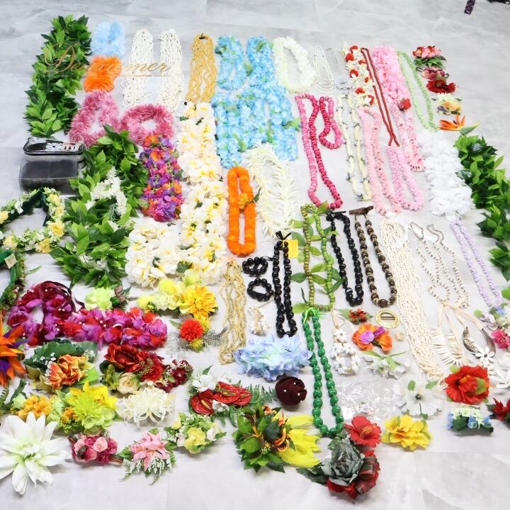 フラダンス 小物 小道具 まとめ売り 全100点以上 セット カラフル ネックレス フラワーレイ リーフレイ 髪飾り 頭飾り ウィッグ リーフ タヒチアン アクセサリー 民族衣装 ダンス小物 ハワイアン イベント ヘアアクセサリー まとめ売り セット販売