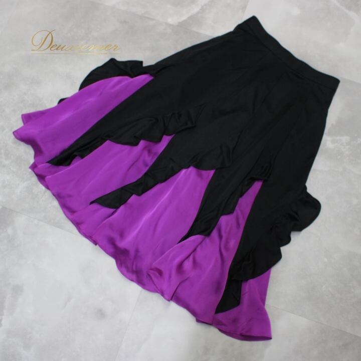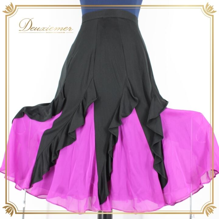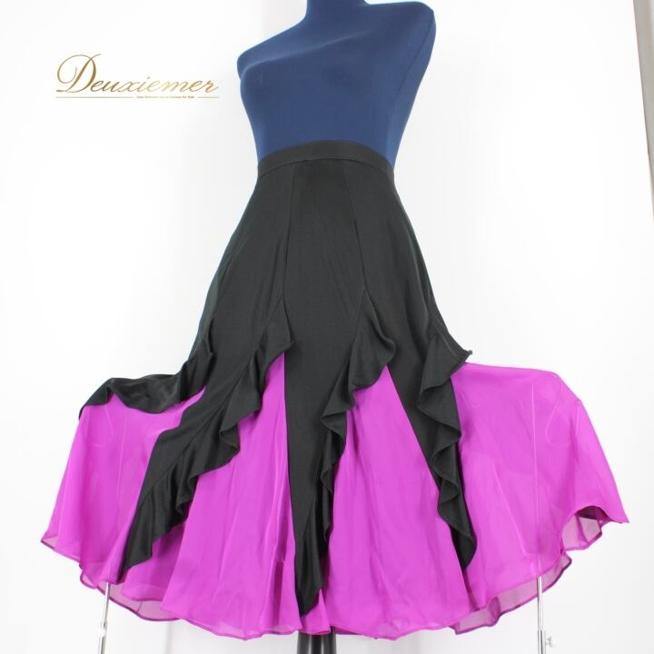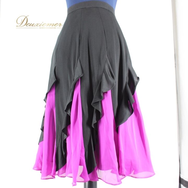 社交ダンス 衣装 スタンダード スカート レッスンウェア 女性用 レディース オールシーズン 黒 紫 ブラック系 パープル系 練習着 無地 フリル ヒラヒラ フレアスカート おしゃれ バイカラーデザイン ダンスウェア 薄手 軽量 ファッション エレガント 快適 体型カバー おすすめ サイズM