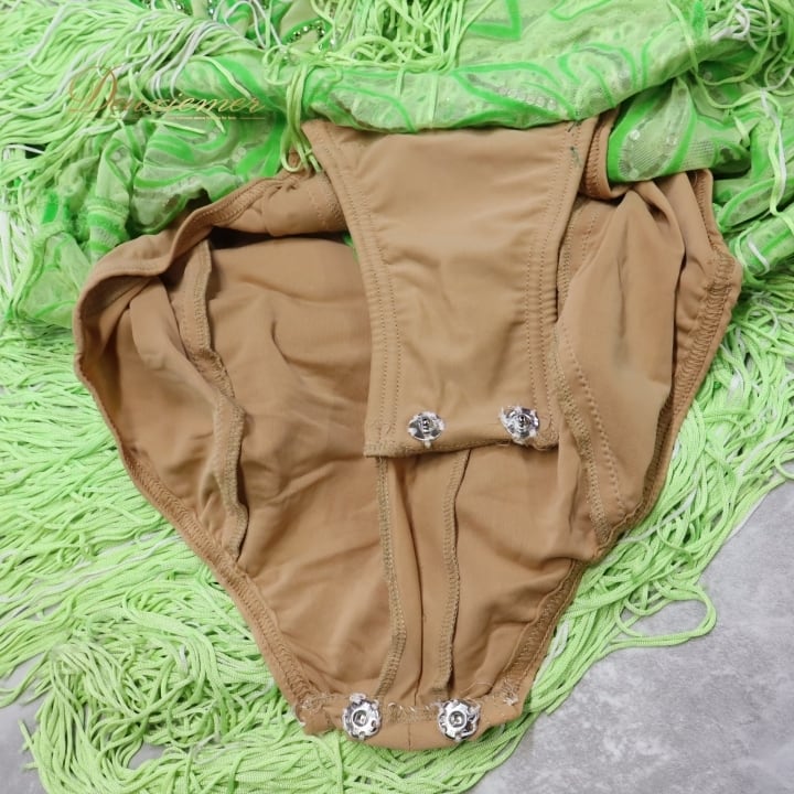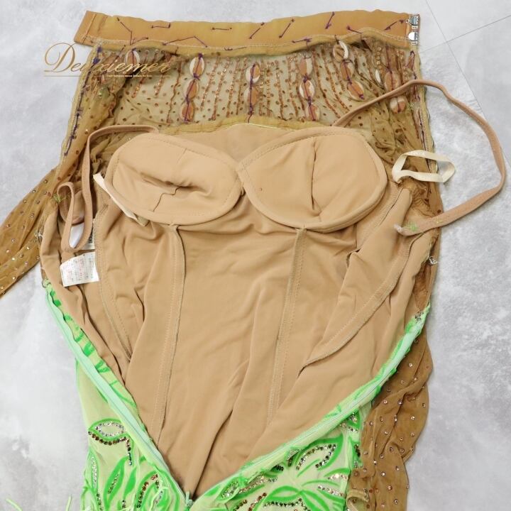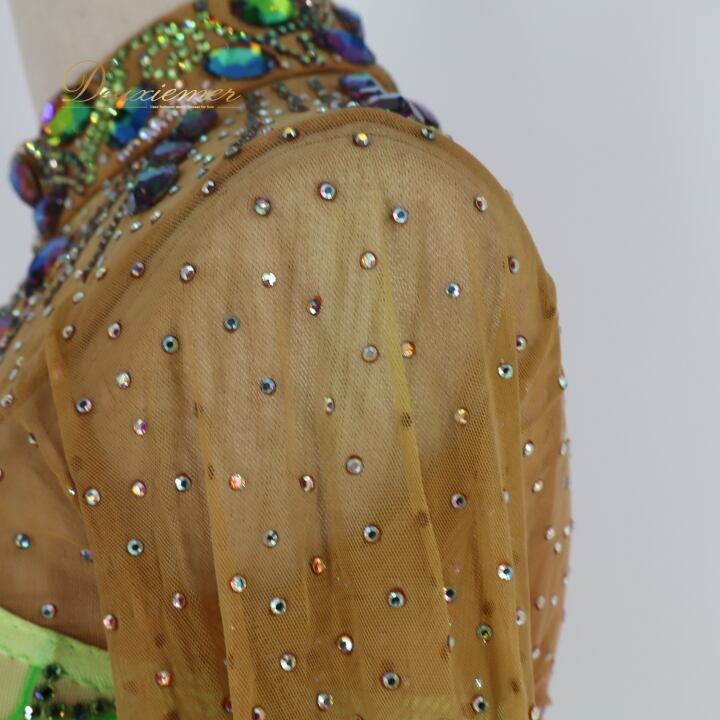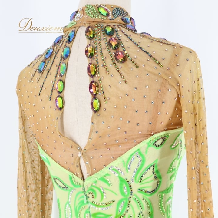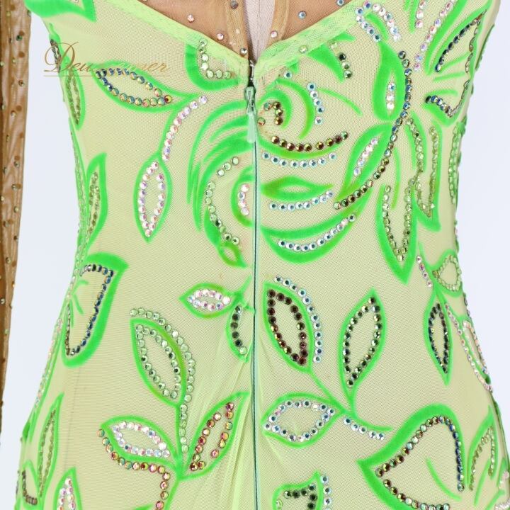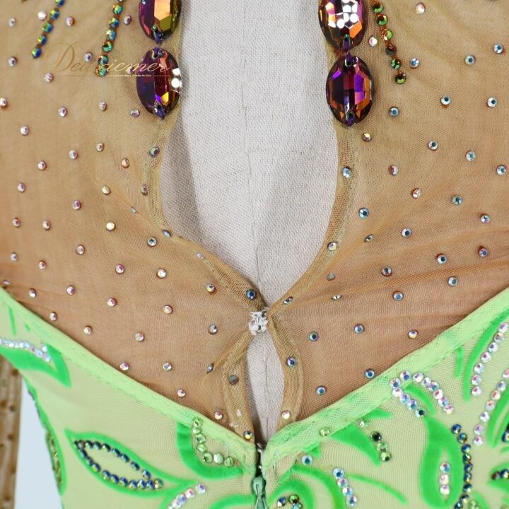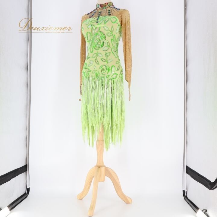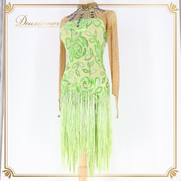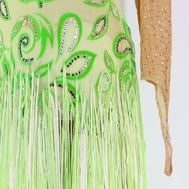 社交ダンス 衣装 チャコット Chacott ラテン ワンピース ラテンドレス 緑 黄緑 ベロア フリンジ グリーン系 長袖 デモ 競技 ダンス パーティ 発表会 キラキラ おしゃれ おすすめ かわいい 女性用 日本製 サイズM 競技用 衣装デザイン