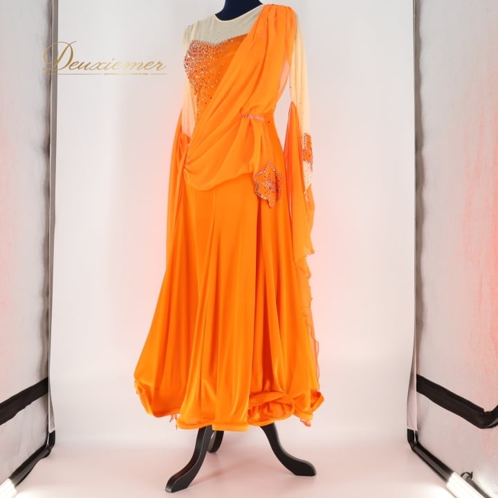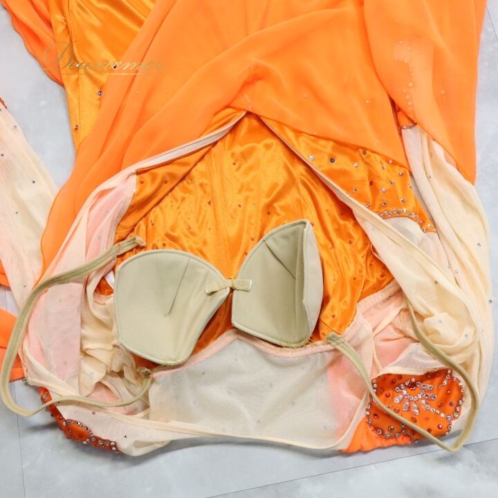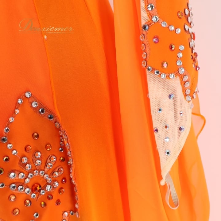 社交ダンス 衣装 スタンダード ドレス スタンダードドレス つきおか フロート レース 無地 デモ 競技 ワンピース オレンジ系 発表会 パーティ 無地 蛍光オレンジ ステージ衣装 ダンスコスチューム 発表用 競技用ドレス