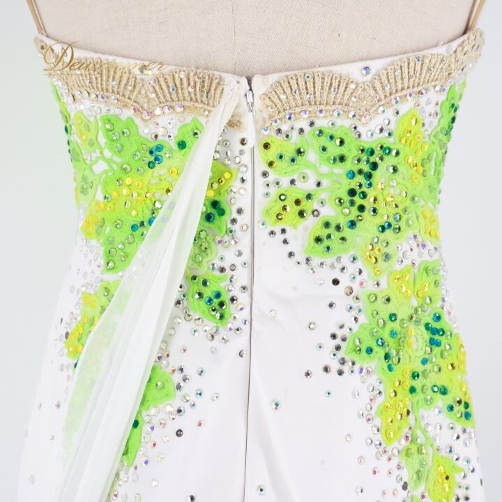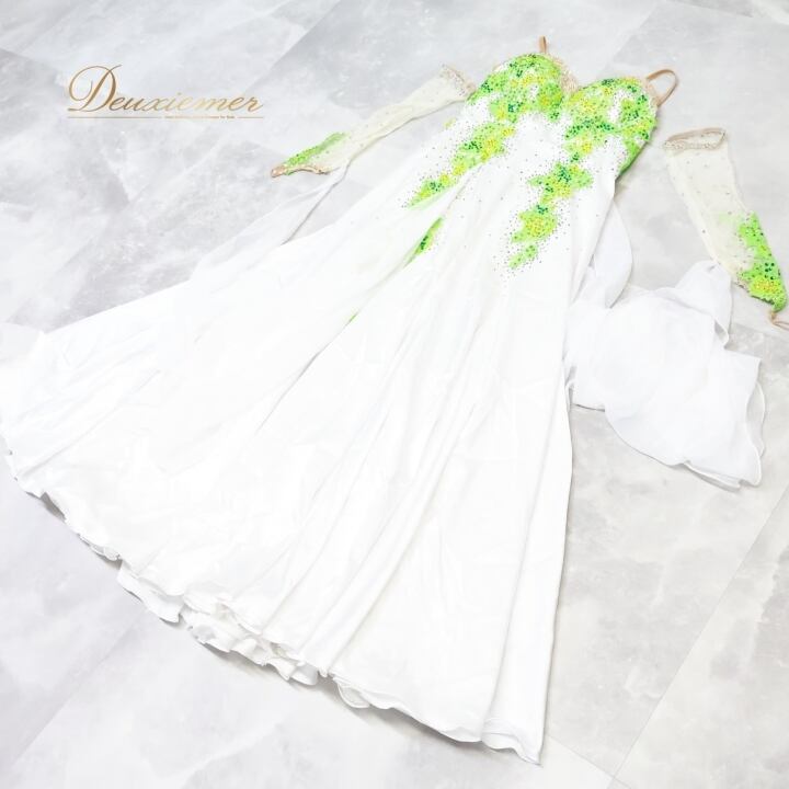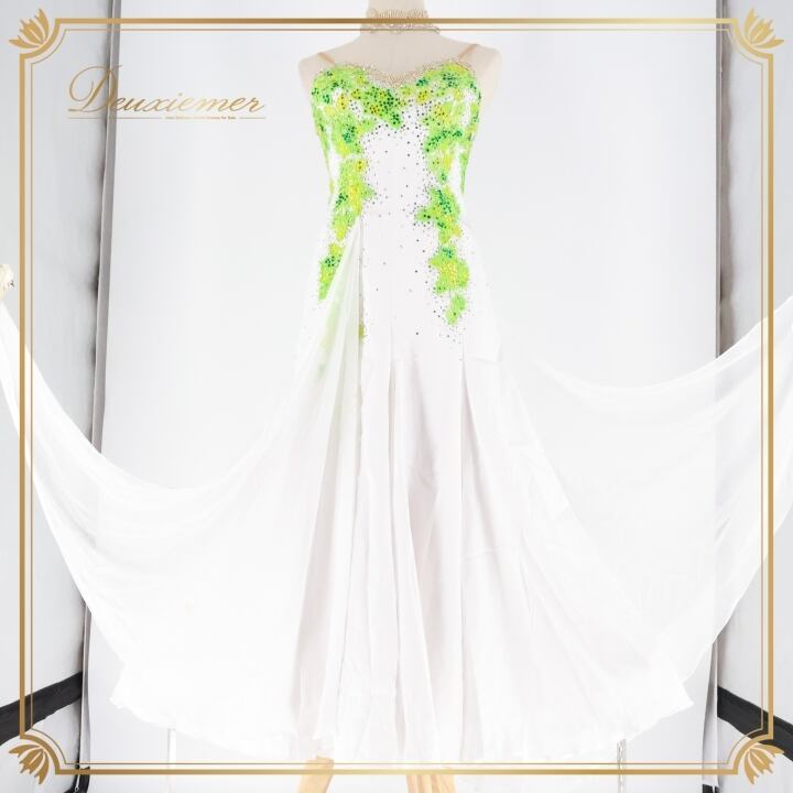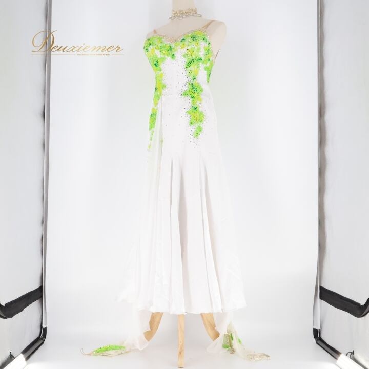 社交ダンス 衣装 ジャンティ gentil スタンダード ドレス ワンピース スタンダードドレス フロート 白 緑 黄緑 デモ 競技 パーティ 発表会 綺麗 落ち感 ホワイト系 グリーン系 ドレス 女性用 エレガント おしゃれ サイズM 競技用 ダンスウェア フォーマル ダンス衣装 舞台衣装 パフォーマンス パーティードレス