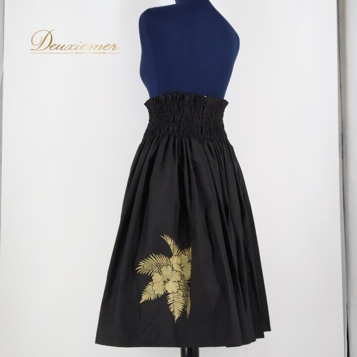 フラダンス 衣装 パウスカート ブラック系 maka hou 日本製 ハイビスカス柄 ハワイアンプリント オールブラック レッスン 練習 アロハ かっこいい 大人っぽい 上品 おしゃれ 高級感 ゴールド系 ラメ 黒 金 ハワイアン フラ ダンス レッスン着 フラダンスレッスン 大人 フラガール おしゃれ衣装 ハワイアンファッション ゴールドプリント