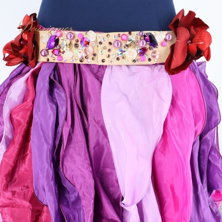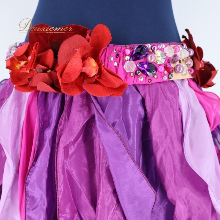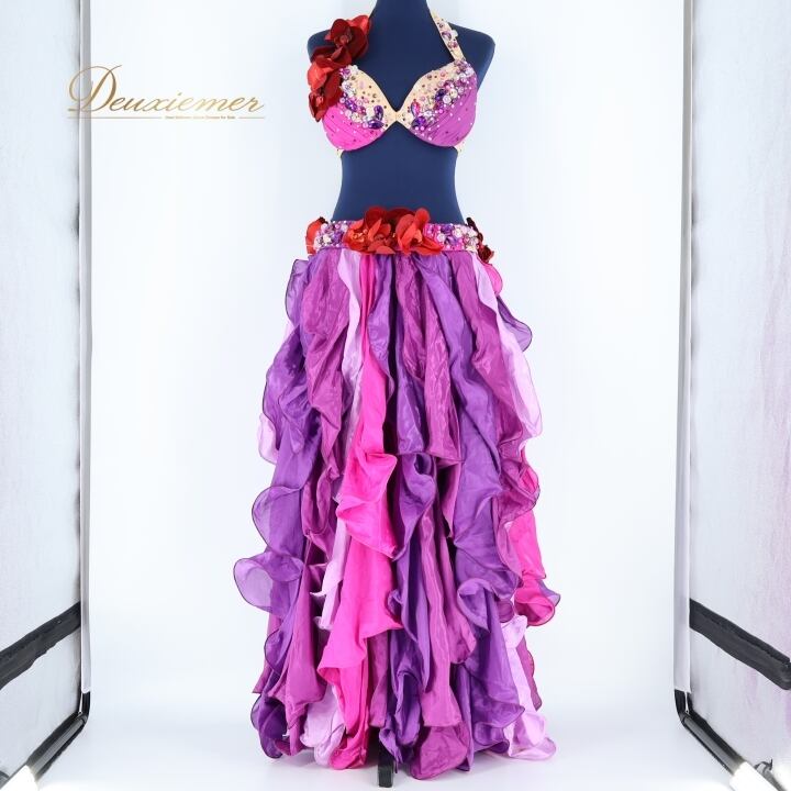 ベリーダンス オリエンタル 衣装 上下セット パープル系 ラインストーン 花 トップス スカート ベルト 紫 赤 フリル 華やか 豪華 装飾 煌びやか ペチコート ペチパンツ ダンス衣装 舞台 鮮やか ストーン スリット キラキラ レッド系 ピンク系