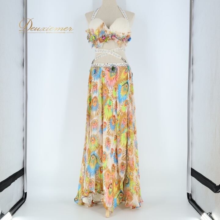 ベリーダンス オリエンタル 衣装 上下セット ホワイト系 ラインストーン トップス スカート ベール 華やか 白 黄 青 茶 紫 豪華 装飾 ストーン インナーパンツ 爽やか 腕飾り アーム飾り かわいい 舞台 イエロー系 ブルー系 ブラウン系 パープル系
