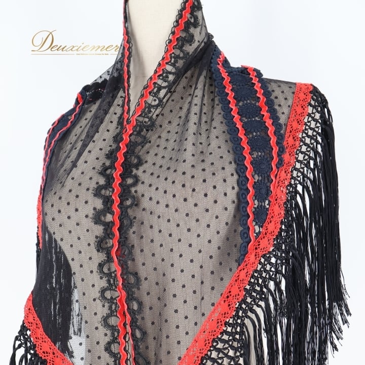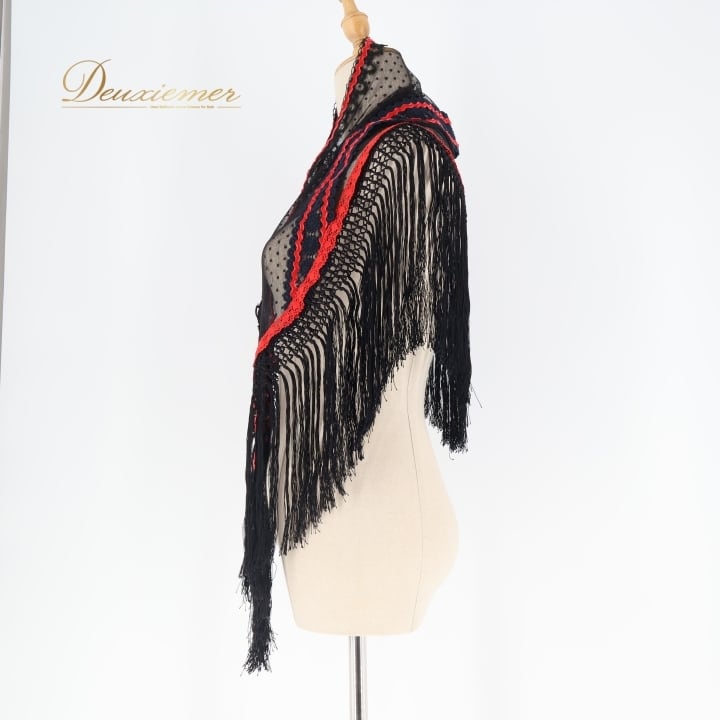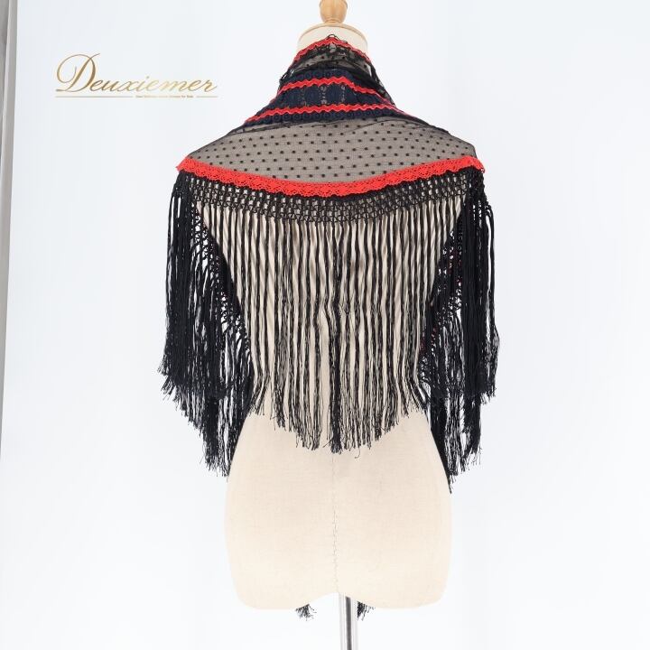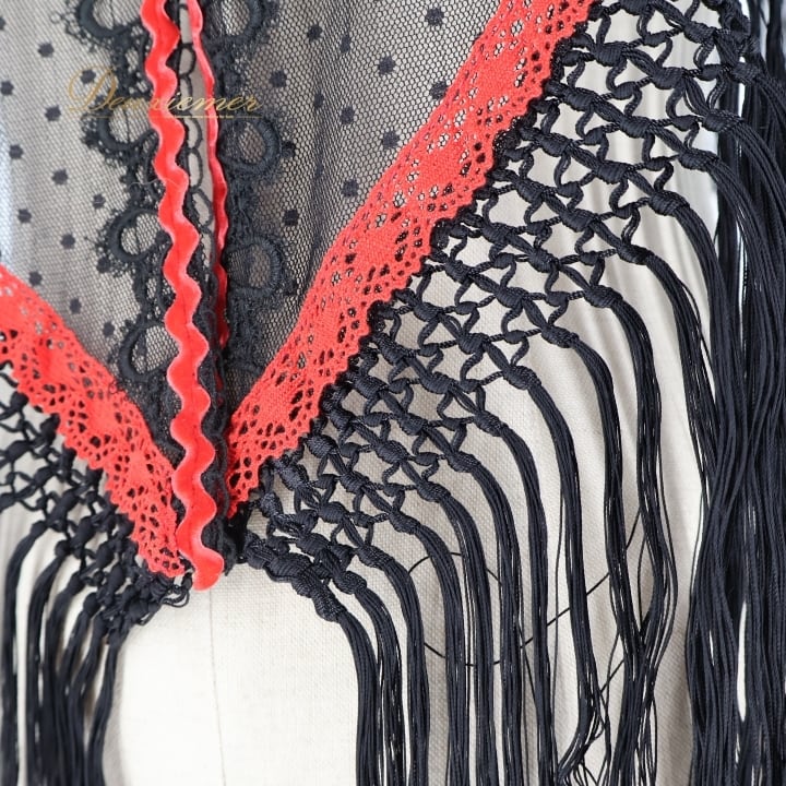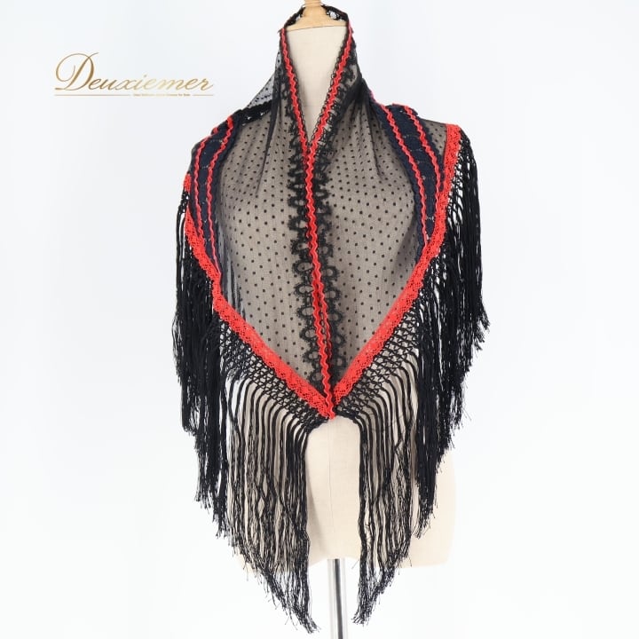フラメンコ 衣装 シージョ 黒 赤 レース フレコ トライアングル 三角形 高級感 小物 装飾 小物 ブラック系 レッド系 透け感 重ね着 レディース 大人用 フェス 衣装 ブラック 黒色 鮮やか おしゃれ ファッション コスチューム