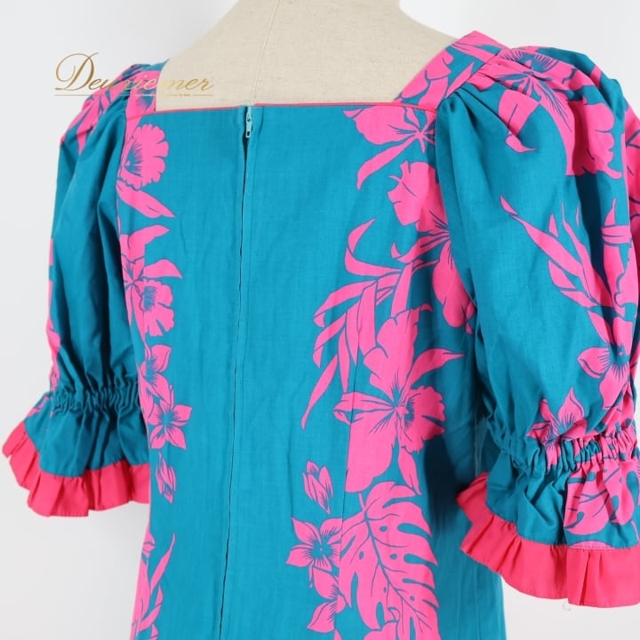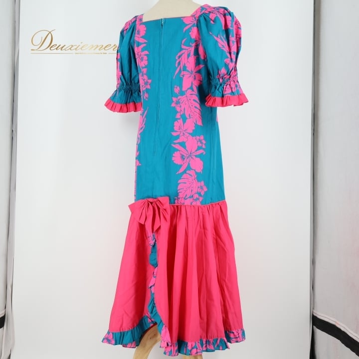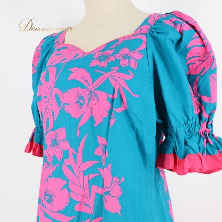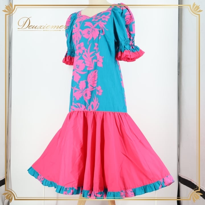 フラダンス 衣装 ワンピース ドレス ブルー系 ハワイアンプリント アロハ フラワープリント 花柄 レッスン 練習 フリル リボン 五分袖 かわいい 華やか 鮮やか おしゃれ 蛍光色 ピンク系 フラ ダンス ハワイアン 可愛いファッション 可愛い衣装 パーティー 花柄ドレス おしゃれコーデ フラダンス衣装 ビビッドカラー
