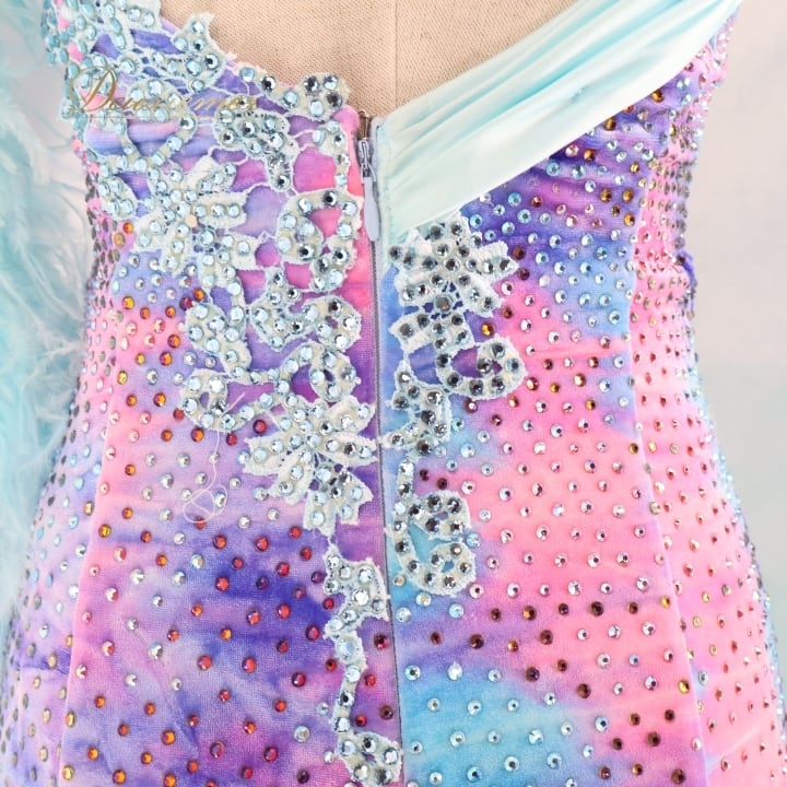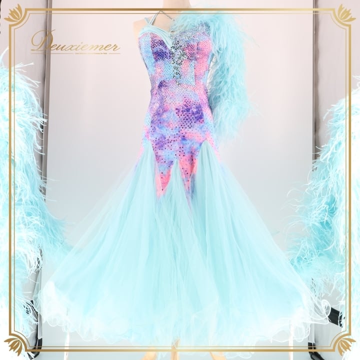 社交ダンス 衣装 スタンダード ドレス スタンダードドレス ワンピース 水色 ピンク 紫 グラデーション ファー 水色 デモ 競技 ダンス パーティ 発表会 ブルー系 フリル 豪華 おしゃれ エレガント ステージ衣装 レディース