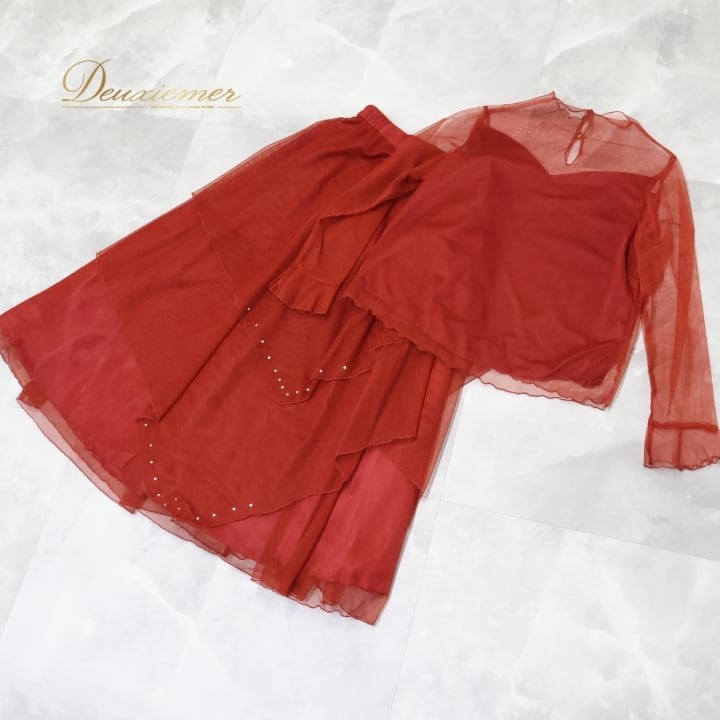 社交ダンス 衣装 スタンダード 上下セット ツーピース レッスンウェア パーティ衣装 女性用 オールシーズン 赤 U:NA ユーナ レッド系 レース ラインストーン セットアップ フォーマル 演出着 ダンスウェア 講師用 競技用 おしゃれ シンプル 上下組み合わせ 体型カバー スカート付き 長袖 ひざ下丈 運動用 薄手 快適素材 カジュアル